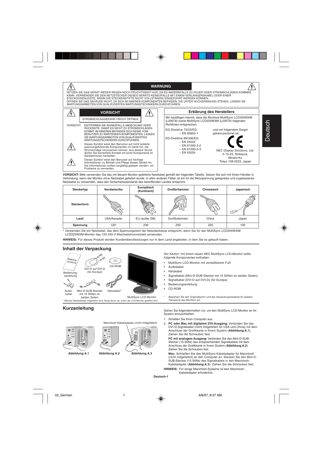 6/6/07, 8:37 AM WARNUNG SETZEN SIE DAS GERÄT WEDER REGEN NOCH FEUCHTIGKEIT AUS, DA ES ANDERNFALLS ZU FEUER ODER STROMSCHLÄGEN KOMMEN KANN. VERWENDEN SIE DEN NETZSTECKER DIESES GERÄTS KEINESFALLS MIT EINEM VERLÄNGERSKABEL ODER EINER STECKDOSENLEISTE, WENN DIE STECKERSTIFTE NICHT VOLLSTÄNDIG EINGEFÜHRT WERDEN KÖNNEN. ÖFFNEN SIE DAS GEHÄUSE NICHT, DA SICH IM INNEREN KOMPONENTEN BEFINDEN, DIE UNTER HOCHSPANNUNG STEHEN. LASSEN SIE WARTUNGSARBEITEN VON QUALIFIZIERTEN WARTUNGSTECHNIKERN DURCHFÜHREN. Wir bestätigen hiermit, dass die Monitore MultiSync LCD205WXM (L206T8) sowie MultiSync LCD225WXM (L226T9) folgenden Richtlinien entsprechen: VORSICHT:
