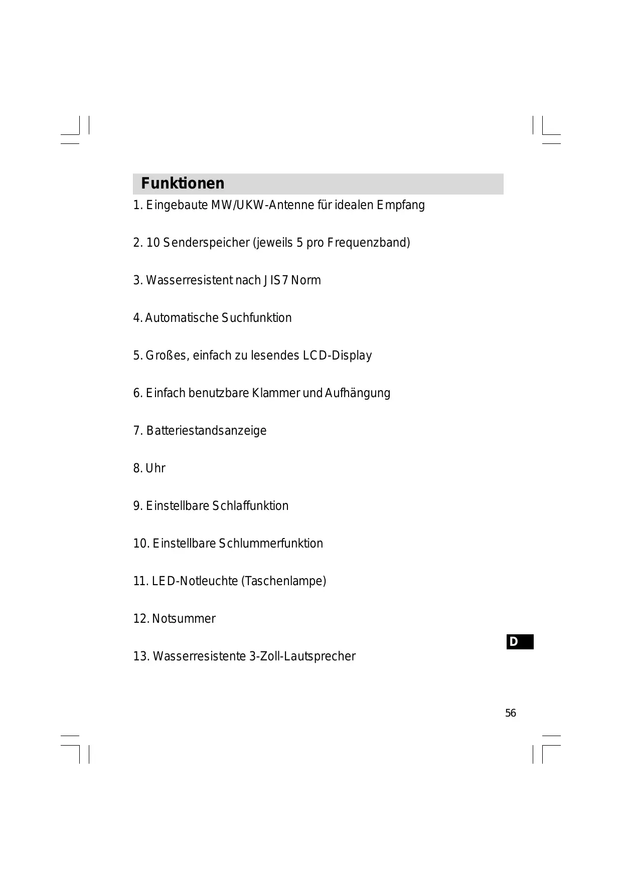Technische Daten Stromnetzanforderungen Netzadapters (nicht im Lieferumfang) nur AC 230V, 50 Hz oder AC 120V, 60 Hz / DC 3V 300 mA Batterien: 2 x UM1 (D, LR20) Batteriebenutzungsdauer: ca. 120 Stunden Hörzeit bei 4 Stunden pro Tag bei normaler Lautstärke mit alkalischen Batterien. Frequenzbereich: UKW 87,50 – 108 MHz MW 522 – 1629 kHz oder 520 – 1710 kHz Schaltkreismerkmale Lautsprecher: 3 Zoll, 8 Vollbereich, wasserresistent Ausgangsleistung: 500 mW Antennensystem: Antennendraht MW Ferritstab