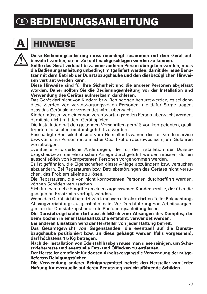 Wenn das Gerät nicht benutzt wird, mussen alle elektrischen Teile (Beleuchtung, Absaugvorrichtung) ausgeschaltet sein. Vor Durchführung von Arbeitsvorgängen an der Dunstabzugshaube die Bedienungsanleitunglesen.