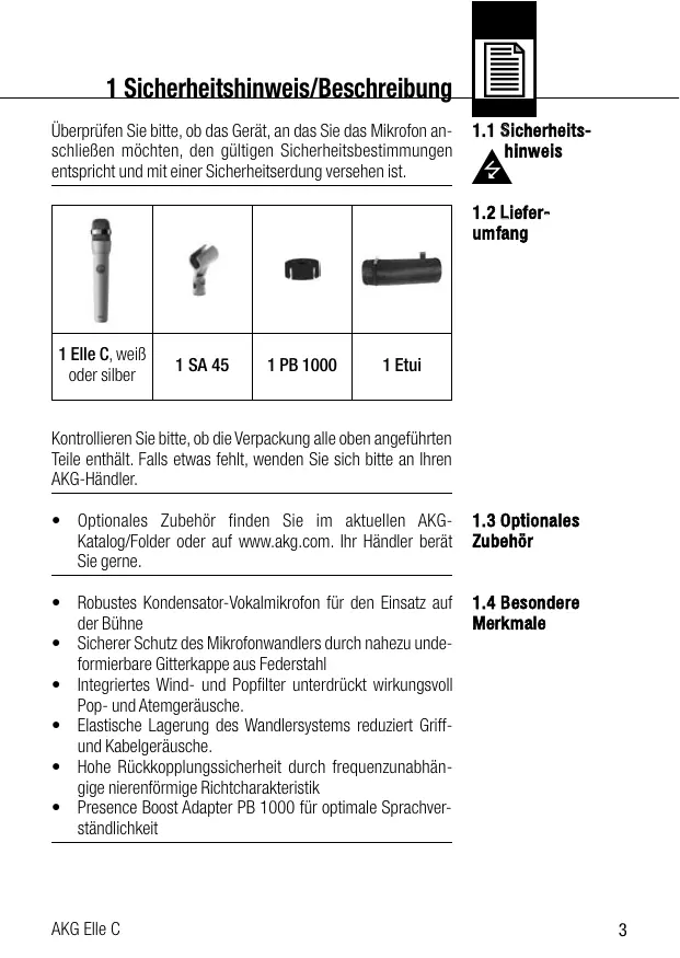 AKG Elle C 1 Sicherheitshinweis/Beschreibung Überprüfen Sie bitte, ob das Gerät, an das Sie das Mikrofon anschließen möchten, den gültigen Sicherheitsbestimmungen entspricht und mit einer Sicherheitserdung versehen ist.