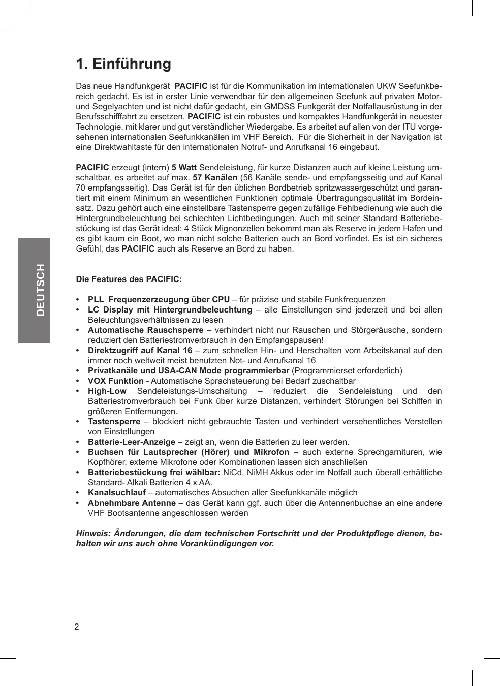 5.1 Mise en marche10 5.2 Sélection du canal opérationnel10 5.3 Volume10 5.4 Transmission et réception10 5.5 Bouton MON (écoute)10 5.6 Choix de la puissance haute ou basse 11 5.7 Rétro éclairage LCD 11 5.8 Rappel du canal 16 11 5.9 Fonction d’économie d’énergie 11 Il offre toute la sécurité relative aux exigences de la navigation maritime par l’accès immédiate au canal d’urgence N°16. Le PACIFIC, fabriqué à partir de composants spécifiques propose 57 canaux et une puissance de 5 Watts. Sa protection contre les embruns fournit une sécurité accrue dans des conditions hostiles. Le PACIFIC garanti d’excellentes performances dans toutes les situations, et grâce à son clavier vérrouillable, il prévient toute manipulation malencontreuse. Son afficheur rétro éclairé permet une utilisation dans la pénombre ou en condition de faible visibilité. En clair: Le PACIFIC est simple à utiliser en toute sécurité Caractéristiques principales: -