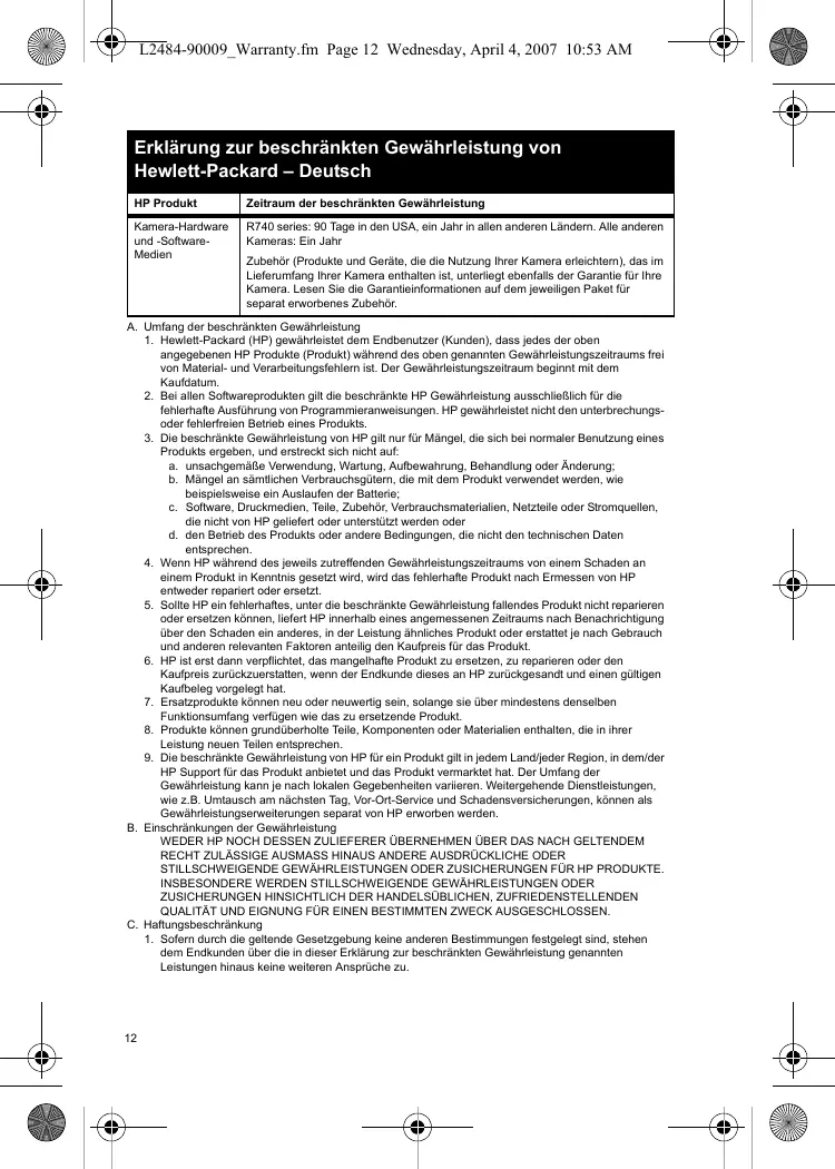 L2484-90009_Warranty.fm Page 12 Wednesday, April 4, 2007 10:53 AM Erklärung zur beschränkten Gewährleistung von Hewlett-Packard – Deutsch HP Produkt