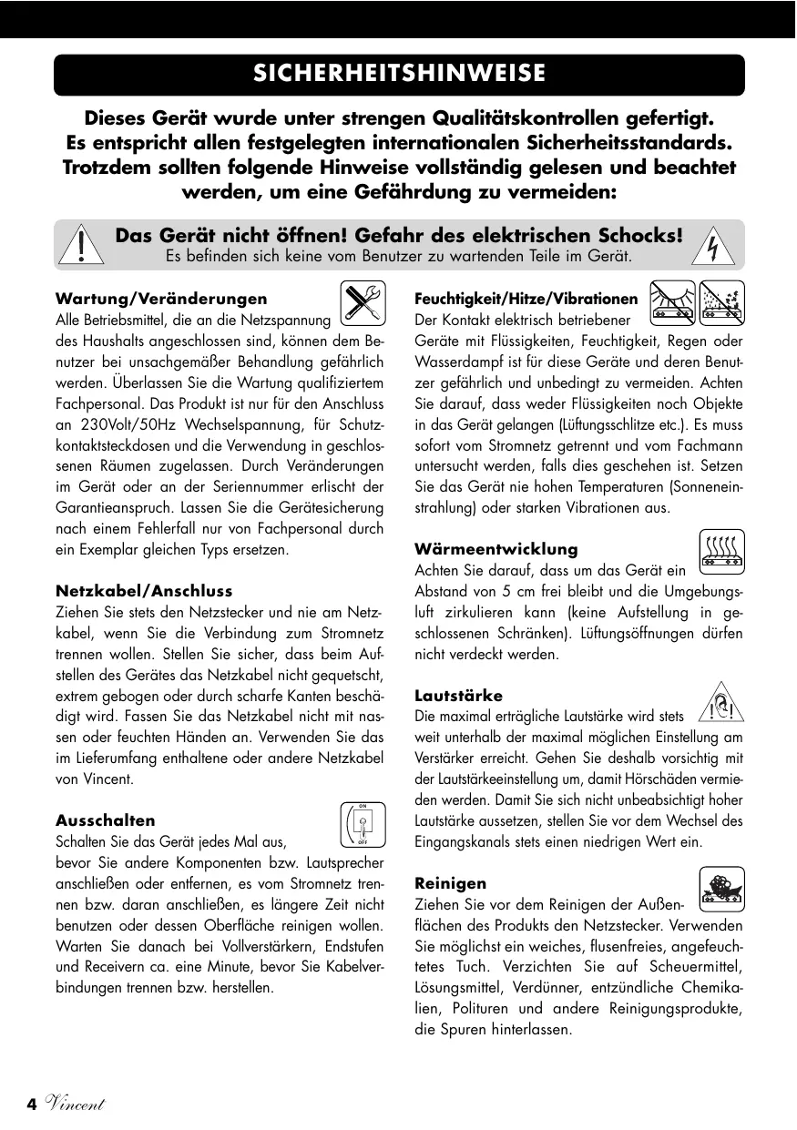 Bitte beachten Sie vor allem die Sicherheitseinweise, auch wenn einige davon offensichtlich erschieren * 們 ogen. Um Ihnen verwendete Fachbegriffe zu erlautern, ist ein kleines Lexikon im Anhang enthalten. Bei eventuellen Fragen steht Ihnen Ihr Fachhändler gern zur Verfugung, er ist auch Ihr Ansprechpartner im Fall der Garantie-lnanspruchnahme oder fur Reparaturen nach dem Gewährleistungszeitraum. Er ist in jedem Fall interessiert daran, dass Sie ihm ihre Erfahrungen mit Vincent-Produkten mitteilen.