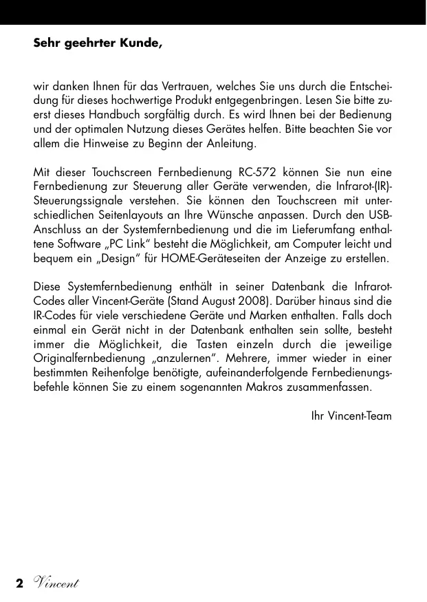 Vincent Bedienungsanleitung deutsch Instructions for use english Manuel d‘utilisation français RC-572 lernfähige, vorprogrammierte Systemfernbedienung learning, pre-programmed universal remote control télécommande universelle programmable avec précodage Sehr geehrter Kunde, wir danken Ihnen für das Vertrauen, welches Sie uns durch die Entscheidung für dieses hochwertige Produkt entgegenbringen. Lesen Sie bitte zuerst dieses Handbuch sorgfältig durch. Es wird Ihnen bei der Bedienung und der optimalen Nutzung dieses Gerätes helfen. Bitte beachten Sie vor allem die Hinweise zu Beginn der Anleitung. Mit dieser Touchscreen Fernbedienung RC-572 können Sie nun eine Fernbedienung zur Steuerung aller Geräte verwenden, die Infrarot-(IR)Steuerungssignale verstehen. Sie können den Touchscreen mit unterschiedlichen Seitenlayouts an Ihre Wünsche anpassen. Durch den USBAnschluss an der Systemfernbedienung und die im Lieferumfang enthaltene Software „PC Link“ besteht die Möglichkeit, am Computer leicht und bequem ein „Design“ für HOME-Geräteseiten der Anzeige zu erstellen. Diese Systemfernbedienung enthält in seiner Datenbank die InfrarotCodes aller Vincent-Geräte (Stand August 2008). Darüber hinaus sind die IR-Codes für viele verschiedene Geräte und Marken enthalten. Falls doch einmal ein Gerät nicht in der Datenbank enthalten sein sollte, besteht immer die Möglichkeit, die Tasten einzeln durch die jeweilige Originalfernbedienung „anzulernen“. Mehrere, immer wieder in einer bestimmten Reihenfolge benötigte, aufeinanderfolgende Fernbedienungsbefehle können Sie zu einem sogenannten Makros zusammenfassen. Ihr Vincent-Team