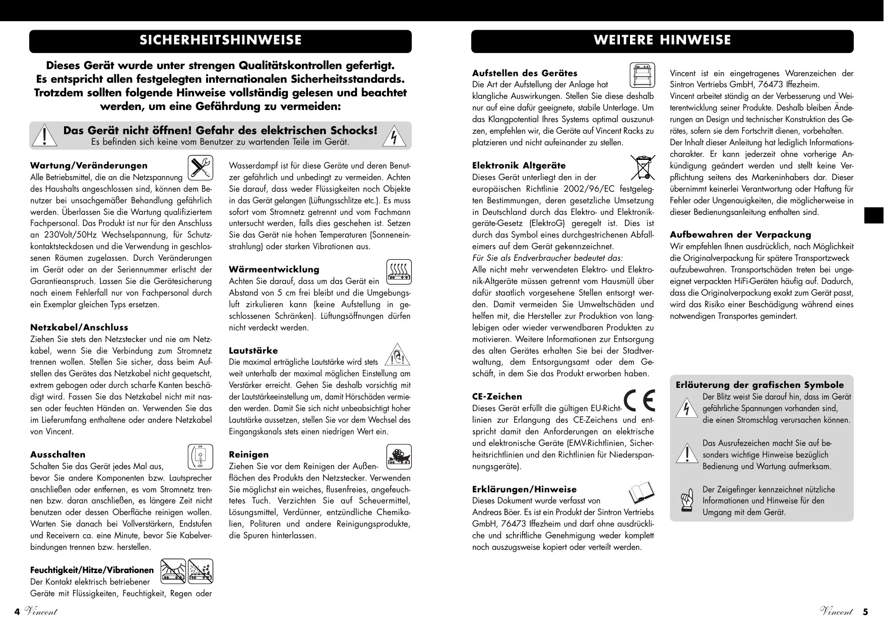 Bitte beachten Sie vor allem die Sicherheitshinweise, auch wenn einige davon offensichtlich erschieren * 們 ogen. Um Ihnen verwendete Fachbegriffe zu erlautern, ist ein kleines Lexikon im Anhang enthalten. Bei eventuellen Fragen steht Ihnen Ihr Fachhändler gern zur Verfugung, er ist auch Ihr Ansprechpartner im Fall der Garantie-Inanspruchnahme oder fur Reparaturen nach dem Gewährleistungszeitaum. Er ist in jedem Fall interessiert daran, dass Sie ihm ihre Erfahrungen mit Vincent-Produkten mitteilen.