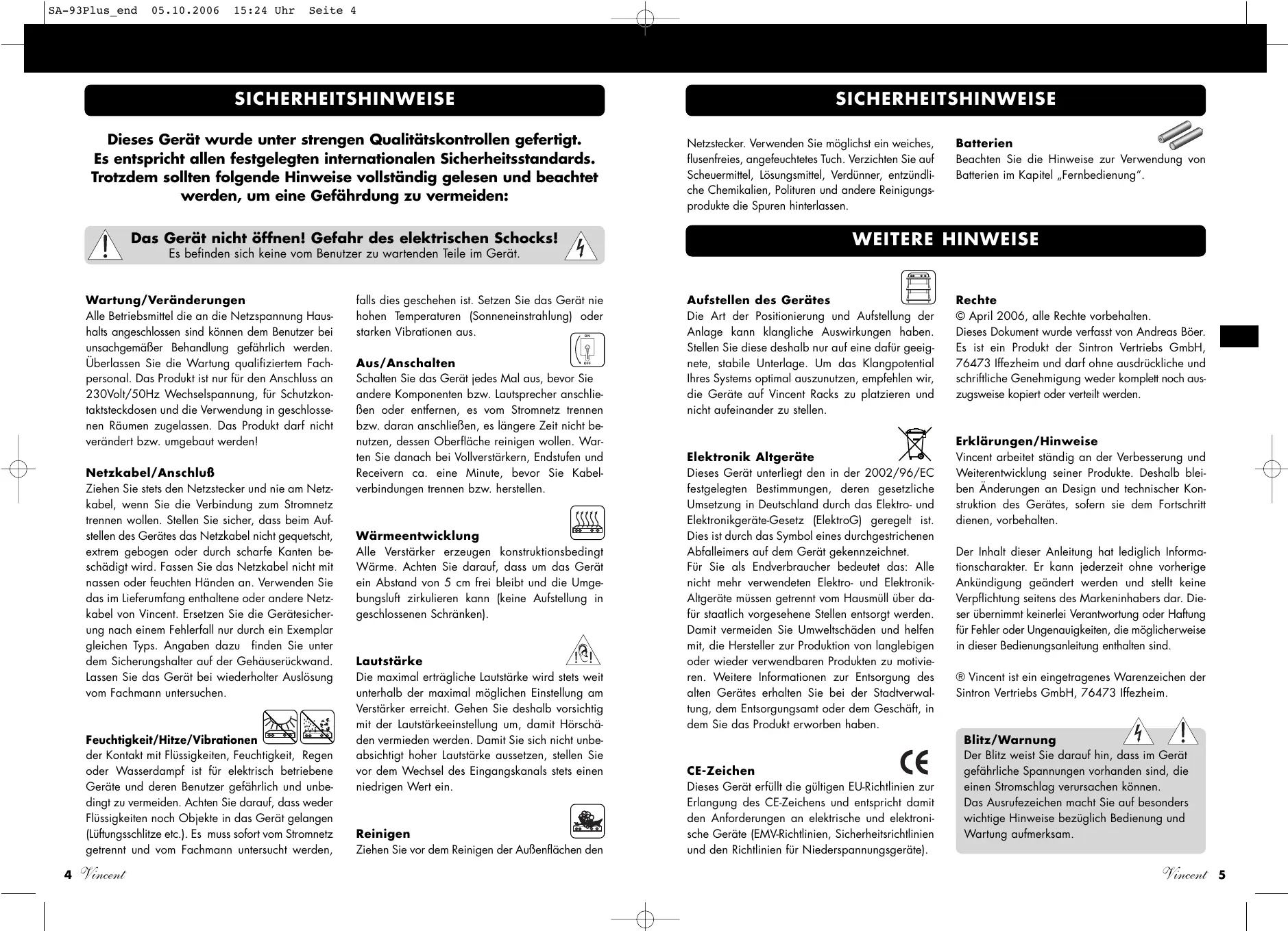 Vincentarbeitetstandigan der Verbesserungund Weiterentwicklungseiner Produkte.DeshalbbleibenÄnderungen an Design und technischer Konstruktion des Gerätes,sofern sie dem Fortschriftdienen,vorbehalten.