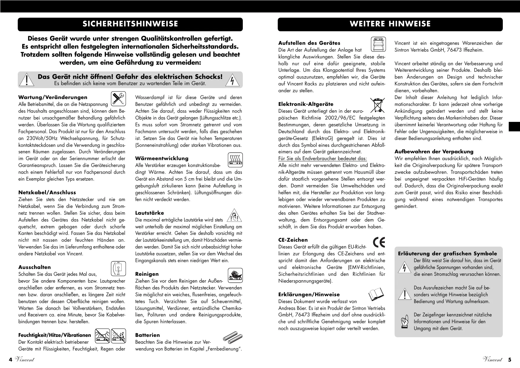 Bitte beachten Sie vor allem die Sicherheitseinweise, auch wenn einige davon offensichtlich erschreibenugen **. Um Ihnen verwendete Fachbegriffe zu erlautern, ist ein kleines Lexikon im Anhang enthalten. Bei eventuellen Fragen steht Ihnen Ihr Fachhändler gern zur Verfugung, er ist auch Ihr Ansprechpartner im Fall der Garantie-lnanspruchnahme oder fur Reparaturen nach dem Gewährleistungszeitaum. Er ist in jedem Fall interessiert daran, dass Sie ihm ihre Erfahrungen mit Vincent-Produkten mitteilen.