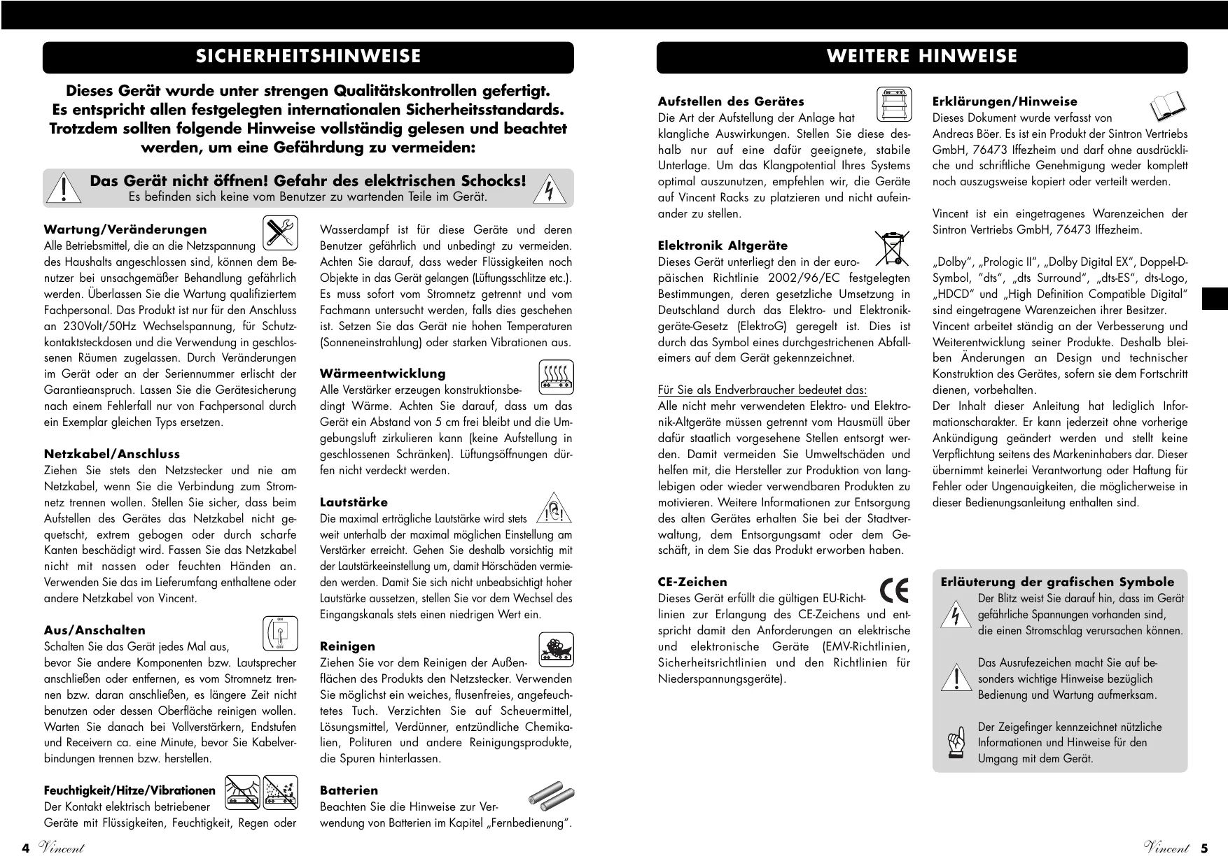 Bitte beachten Sie vor allem die Sicherheitshinweise, auch wenn einige davon offensichtlich erschieren * 們 ogen. Um Ihnen verwendete Fachbegriffe zu erlautern, ist ein kleines Lexikon im Anhang enthalten. Bei eventuellen Fragen steht Ihnen Ihr Fachhändler gern zur Verfugung, er ist auch Ihr Ansprechpartner im Fall der Garantie-Inanspruchnahme oder fur Reparaturen nach dem Gewährleistungszeitarum. Er ist in jedem Fall interessiert daran, dass Sie ihm ihre Erfahrungen mit Vincent-Produkten mitteilen.
