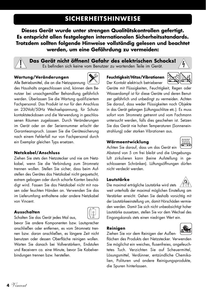Bitte beachten Sie vor allem die Sicherheitseinweise, auch wenn einige davon offensichtlich erschieren * 們 ogen. Um Ihnen verwendete Fachbegriffe zu erlautern, ist ein kleines Lexikon im Anhang enthalten. Bei eventuellen Fragen steht Ihnen Ihr Fachhändler gern zur Verfugung, er ist auch Ihr Ansprechpartner im Fall der Garantie-Inanspruchnahme oder fur Reparaturen nach dem Gewährleistungszeitaum. Er ist in jedem Fall interessiert daran, dass Sie im ihre Erfahrungen mit Vincent-Produkten mitteilen.