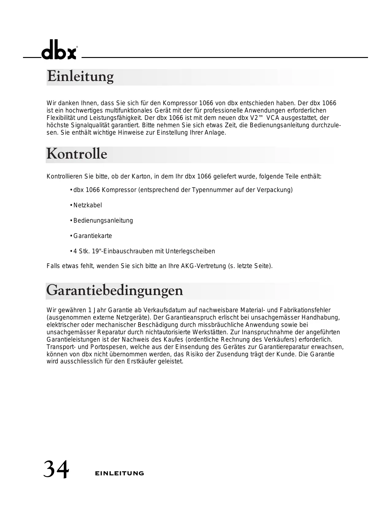 - 4 Stk. 19"-Einbauschrauben mit Unterlegscheiben Falls etwas fehlt, wenden Sie sich bitte an Ihre AKG-Vertretung (s. letzte Seite). Garantiebedingungen Wir gewähren 1 Jahr Garantie ab Verkaufsdatum auf nachweisbare Material- und Fabrikationsfehler (ausgenommen externe Netzgeräte). Der Garantieanspruch erlischt bei unsachgemässer Handhabung, elektrischer oder mechanischer Beschädigung durch missbräuchliche Anwendung sowie bei unsachgemässer Reparatur durch nichtautorisierte Werkstätten. Zur Inanspruchnahme der angeführten Garantieleistungen ist der Nachweis des Kaufes (ordentliche Rechnung des Verkäufers) erforderlich. Transport- und Portospesen, welche aus der Einsendung des Gerätes zur Garantiereparatur erwachsen, können von dbx nicht übernommen werden, das Risiko der Zusendung trägt der Kunde. Die Garantie wird ausschliesslich für den Erstkäufer geleistet.