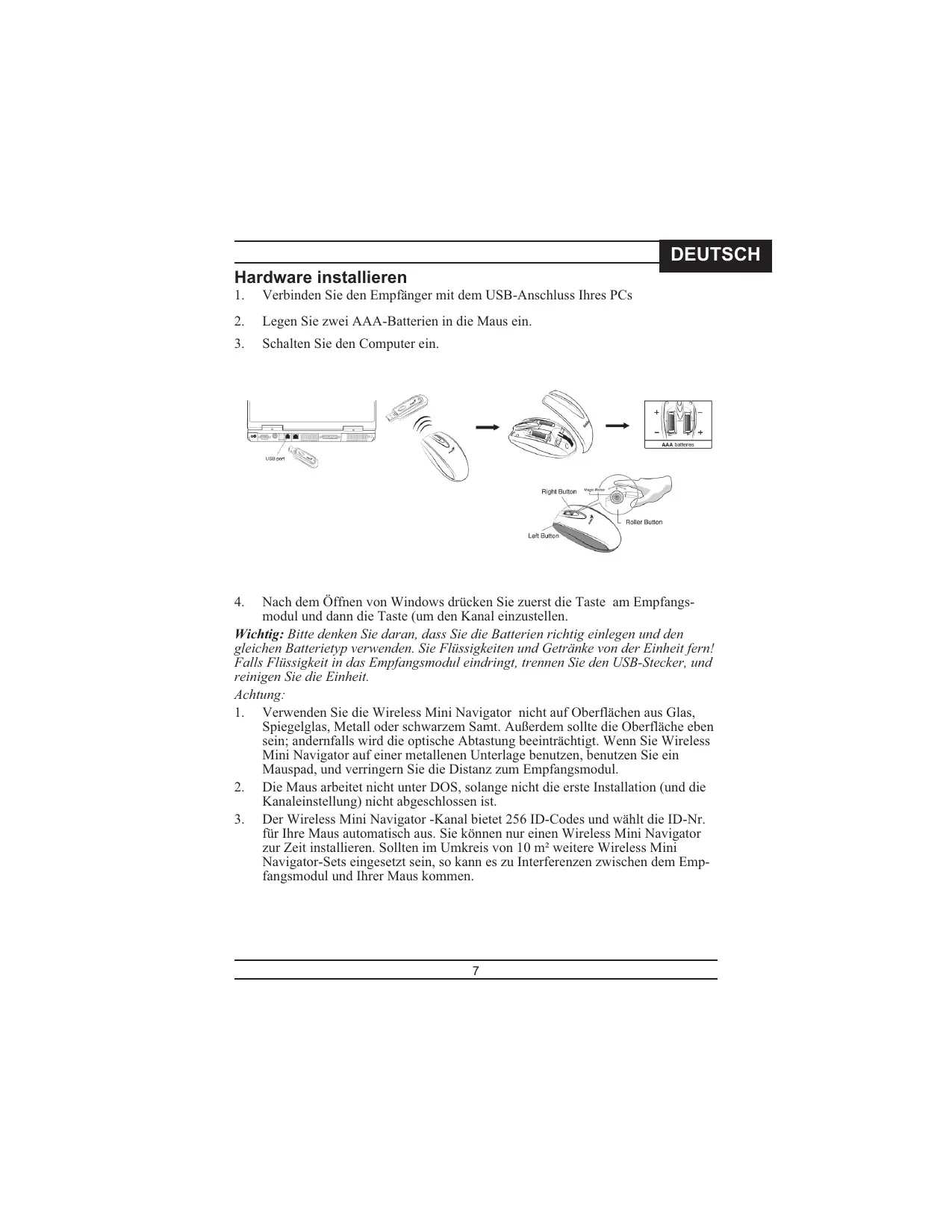Sollte Ihre Maus sich nicht leicht und flüssig bewegen, so sind ihre Batterien erschöpft. Bitte tauschen Sie sie aus. Die Funkwellen von Wireless Mini Navigator lassen Ihnen volle Bewegungsfreiheit und sorgen für eine angenehme, ganz n eue Erfahrung. Optimaler Weise positionieren Sie das Empfangsmodul mindestens 20 cm entfernt von der Maus, und anderen elektrischen Geräten, wie dem Computer, dem Monitor und ähnlichen. Ein Druck auf jede beliebige Maustaste bringt die Maus aus dem Energiesparmodus. Software installieren