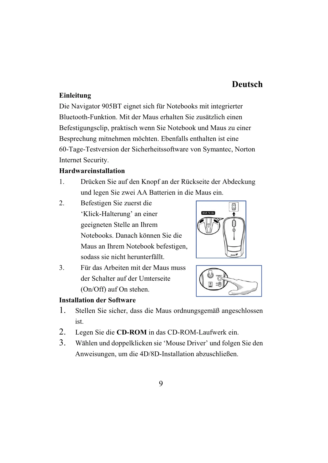Deutsch Einleitung Die Navigator 905BT eignet sich für Notebooks mit integrierter Bluetooth-Funktion. Mit der Maus erhalten Sie zusätzlich einen Befestigungsclip, praktisch wenn Sie Notebook und Maus zu einer Besprechung mitnehmen möchten. Ebenfalls enthalten ist eine 60-Tage-Testversion der Sicherheitssoftware von Symantec, Norton Internet Security. Hardwareinstallation