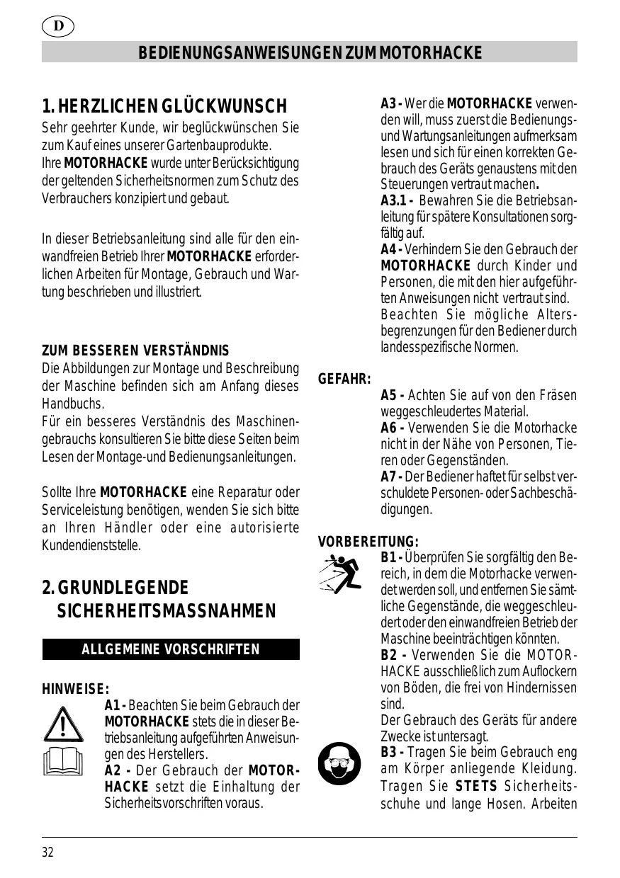 2. GRUNDLEGENDE SICHERHEITSMASSNAHMEN ALLGEMEINE VORSCHRIFTEN HINWEISE: A1 - Beachten Sie beim Gebrauch der MOTORHACKE stets die in dieser Betriebsanleitung aufgeführten Anweisungen des Herstellers. A2 - Der Gebrauch der MOTORHACKE setzt die Einhaltung der Sicherheitsvorschriften voraus. 32