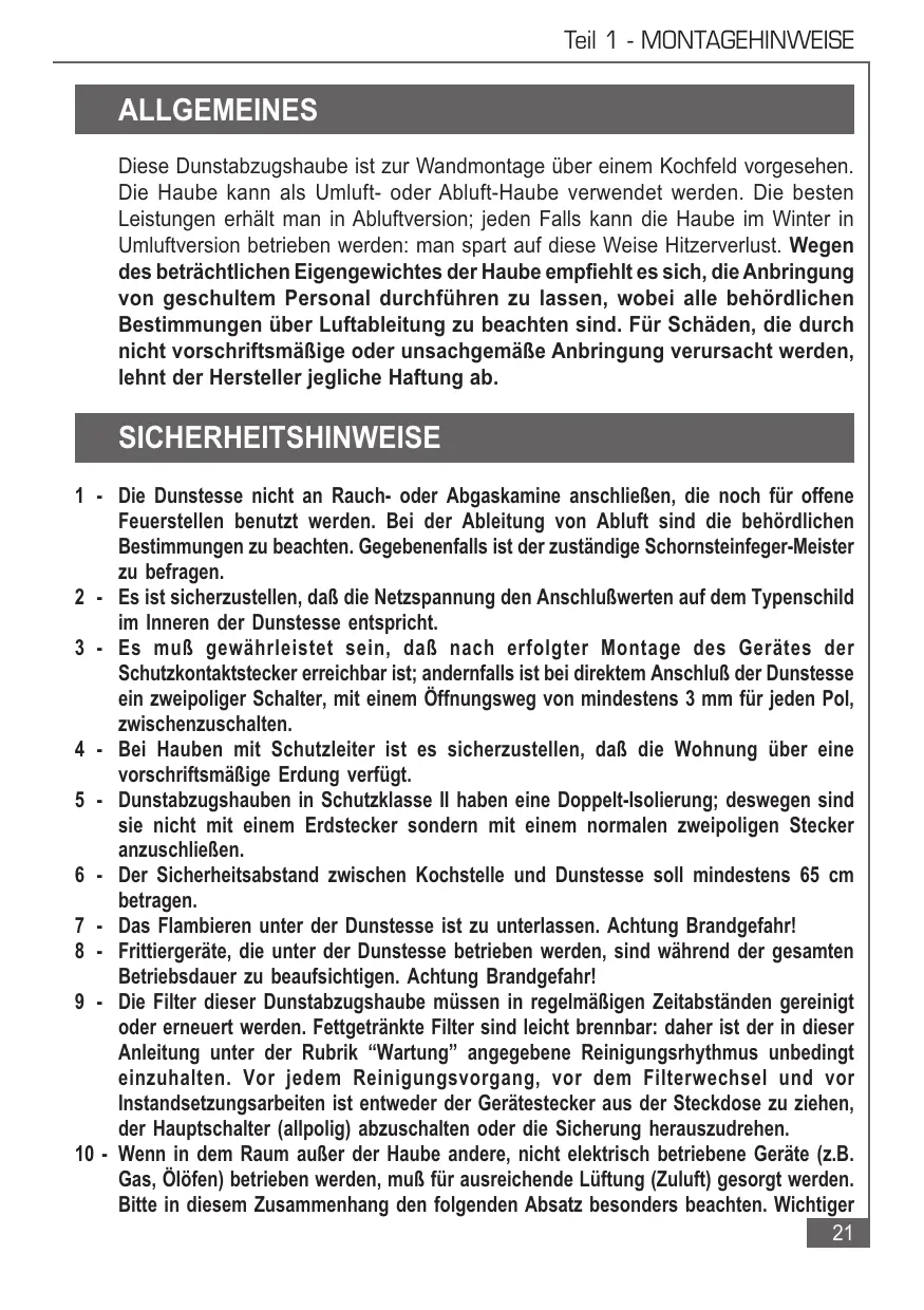 Teil 1 - MONTAGEHINWEISE ALLGEMEINES Diese Dunstabzugshaube ist zur Wandmontage über einem Kochfeld vorgesehen. Die Haube kann als Umluft- oder Abluft-Haube verwendet werden. Die besten Leistungen erhält man in Abluftversion; jeden Falls kann die Haube im Winter in Umluftversion betrieben werden: man spart auf diese Weise Hitzerverlust. Wegen des beträchtlichen Eigengewichtes der Haube empfiehlt es sich, die Anbringung von geschultem Personal durchführen zu lassen, wobei alle behördlichen Bestimmungen über Luftableitung zu beachten sind. Für Schäden, die durch nicht vorschriftsmäßige oder unsachgemäße Anbringung verursacht werden, lehnt der Hersteller jegliche Haftung ab. SICHERHEITSHINWEISE