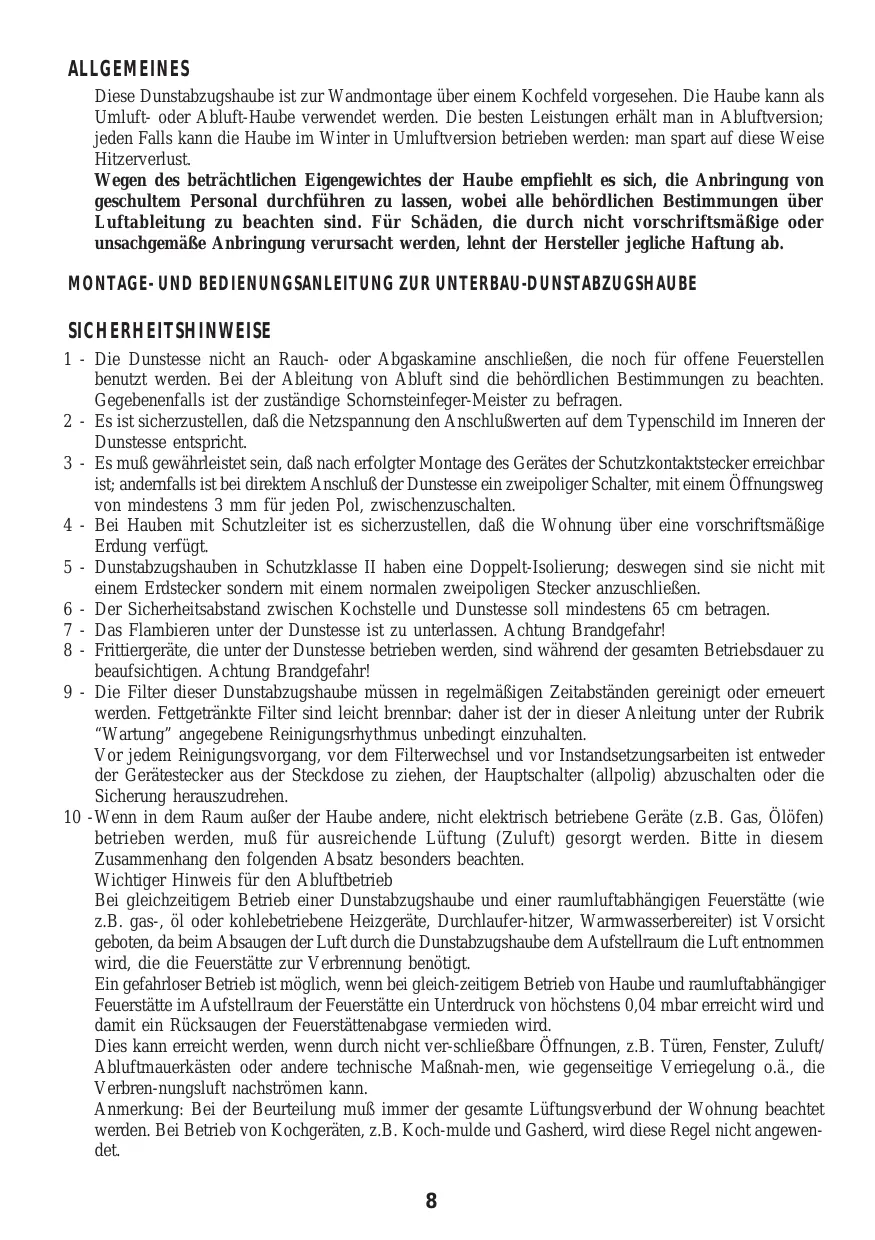 ALLGEMEINES Diese Dunstabzugshaube ist zur Wandmontage über einem Kochfeld vorgesehen. Die Haube kann als Umluft- oder Abluft-Haube verwendet werden. Die besten Leistungen erhält man in Abluftversion; jeden Falls kann die Haube im Winter in Umluftversion betrieben werden: man spart auf diese Weise Hitzerverlust. Wegen des beträchtlichen Eigengewichtes der Haube empfiehlt es sich, die Anbringung von geschultem Personal durchführen zu lassen, wobei alle behördlichen Bestimmungen über Luftableitung zu beachten sind. Für Schäden, die durch nicht vorschriftsmäßige oder unsachgemäße Anbringung verursacht werden, lehnt der Hersteller jegliche Haftung ab.