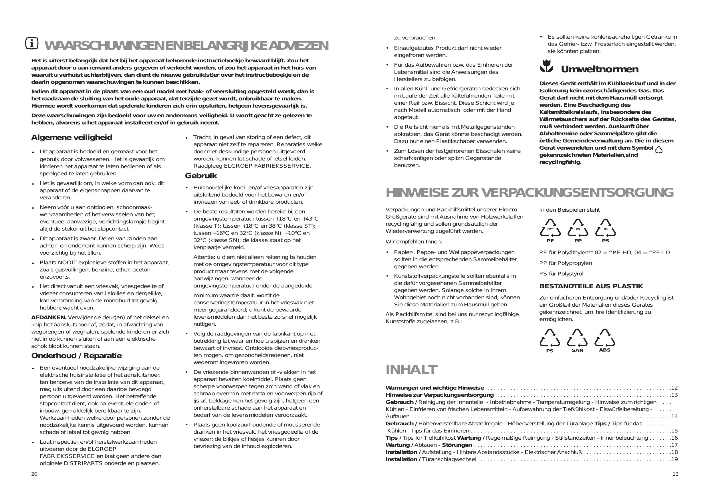 Es ist sehr wichtig, daß diese Bedienungsanleitung mit dem betreffenden Gerät aufbewahrt wird. Sollte dieses Gerät verkauft bzw. einer anderen Person gegeben werden, so ist es nötig, die Anleitung beizufügen, damit der neue Besitzer über den Betrieb des Gerätes bzw. die entsprechenden Warnungen. Sollte dieses Gerät mit Magnet-Türverschluß als Ersatz für ein altes Gerät dienen, das noch mit einem Schnappschloß ausgerüstet ist, so machen Sie bitte dieses Schloß unbrauchbar, bevor Sie das Gerät beiseite stellen oder zum Müll geben. Sie verhindern damit, daß spielende Kinder sich selbst einsperren und damit in Lebensgefahr kommen. Belangrijk: als de voedingskabel beschadigd raakt, moet de kabel, eventueel met stekers, vervangen worden; deze onderdelen zijn verkrijgbaar bij de fabrikant of het servicecentrum.