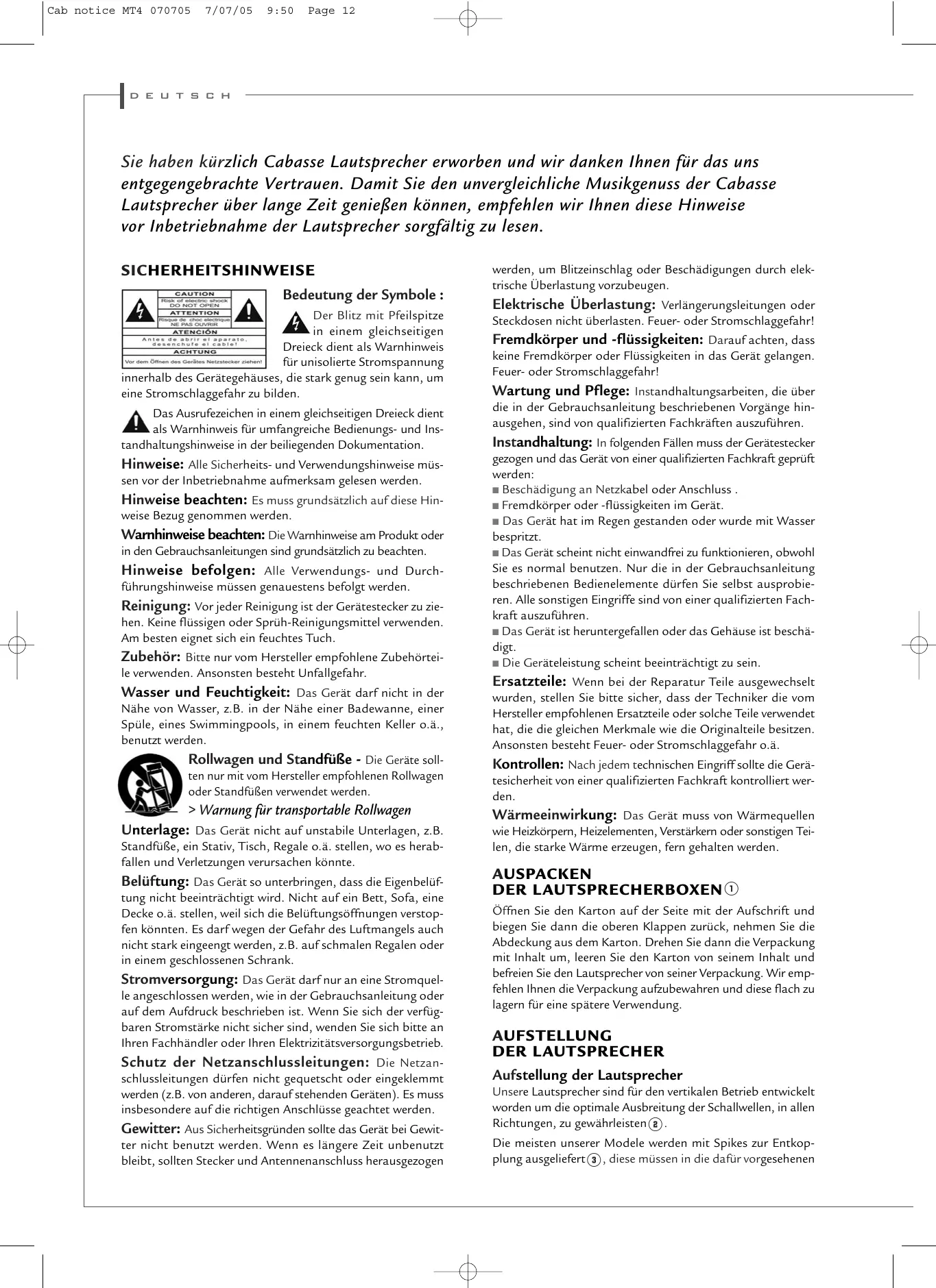 Sie haben kürzlich Cabasse Lautsprecher erworben und wir danken Ihnen für das uns entgegengebrachte Vertrauen. Damit Sie den unvergleichliche Musikgenuss der Cabasse Lautsprecher über lange Zeit genießen konnen, empfehlen wir Ihnen diese Hinweise vor Inbetriebnahme der Lautsprecher sorgfältig zulesen.