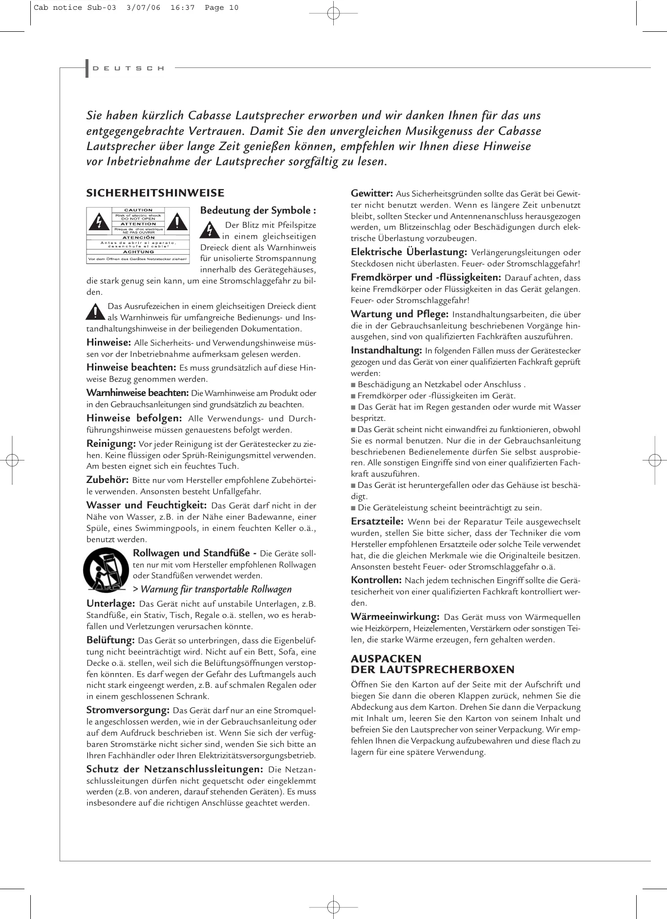 Sie haben kürzlich Cabasse Lautsprecher erworben und wir danken Ihnen für das uns entgegenbebrachte Vertrauen. Damit Sie den unvergleichen Musikgenuss der Cabasse Lautsprecher über lange Zeit genießen konnen, empfehlen wir Ihnen diese Hinweise vor Inbetriebnahme der Lautsprecher sorgfältig zulesen.