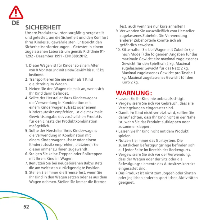 FR DE SICHERHEIT Unsere Produkte wurden sorgfältig hergestellt und getestet, um die Sicherheit und den Komfort Ihres Kindes zu gewährleisten. Entspricht den Sicherheitsanforderungen – Getestet in einem zugelassenen Laboratrium gemäß Richtlinie 911292 - Dezember 1991 - EN1888:2012. 1. Dieser Wagen ist für Kinder ab einem Alter von 0 Monaten und mit einem Gewicht bis zu 15 kg bestimmt. 2. T ransportieren Sie nie mehr als 1 Kind gleichzeitig im Wagen. 3. Heben Sie den Wagen niemals an, wenn sich Ihr Kind darin befindet. 4. S ollte der Hersteller Ihres Kinderwagens die Verwendung in Kombination mit einem Kinderwagenaufsatz oder einem Kinderautositz empfehlen, ist die maximale Gewichtsangabe des zusätzlichen Produkts für den Einsatz der Produktkombination maßgeblich. 5. S ollte der Hersteller Ihres Kinderwagens die Verwendung in Kombination mit einem Kinderwagenaufsatz oder einem Kinderautositz empfehlen, platzieren Sie diesen immer zu Ihnen zugewandt. 6. Steigen Sie keine Treppen oder Rolltreppen mit Ihrem Kind im Wagen. 7. B enutzen Sie bei neugeborenen Babys stets die am weitesten zurückgeneigte Position. 8. Stellen Sie immer die Bremse fest, wenn Sie Ihr Kind in den Wagen setzen oder es aus dem Wagen nehmen. Stellen Sie immer die Bremse