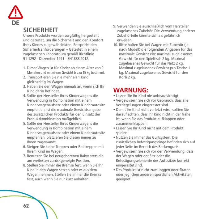 DE SICHERHEIT Unsere Produkte wurden sorgfältig hergestellt und getestet, um die Sicherheit und den Komfort Ihres Kindes zu gewährleisten. Entspricht den Sicherheitsanforderungen – Getestet in einem zugelassenen Laboratrium gemäß Richtlinie 91-1292 - Dezember 1991 - EN1888:2012. 1. Dieser Wagen ist für Kinder ab einem Alter von 0 Monaten und mit einem Gewicht bis zu 15 kg bestimmt. 2. Transportieren Sie nie mehr als 1 Kind gleichzeitig im Wagen. 3. Heben Sie den Wagen niemals an, wenn sich Ihr Kind darin befindet. 4. Sollte der Hersteller Ihres Kinderwagens die Verwendung in Kombination mit einem Kinderwagenaufsatz oder einem Kinderautositz empfehlen, ist die maximale Gewichtsangabe des zusätzlichen Produkts für den Einsatz der Produktkombination maßgeblich. 5. Sollte der Hersteller Ihres Kinderwagens die Verwendung in Kombination mit einem Kinderwagenaufsatz oder einem Kinderautositz empfehlen, platzieren Sie diesen immer zu Ihnen zugewandt. 6. Steigen Sie keine Treppen oder Rolltreppen mit Ihrem Kind im Wagen. 7. Benutzen Sie bei neugeborenen Babys stets die am weitesten zurückgeneigte Position. 8. Stellen Sie immer die Bremse fest, wenn Sie Ihr Kind in den Wagen setzen oder es aus dem Wagen nehmen. Stellen Sie immer die Bremse fest, auch wenn Sie nur kurz anhalten!
