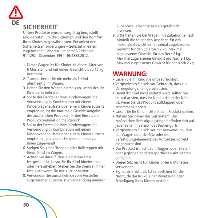 FR DE SICHERHEIT Unsere Produkte wurden sorgfältig hergestellt und getestet, um die Sicherheit und den Komfort Ihres Kindes zu gewährleisten. Entspricht den Sicherheitsanforderungen – Getestet in einem zugelassenen Laboratrium gemäß Richtlinie 91-1292 - Dezember 1991 - EN1888:2012. 1. Dieser Wagen ist für Kinder ab einem Alter von 6 Monaten und mit einem Gewicht bis zu 15 kg bestimmt. 2. Transportieren Sie nie mehr als 1 Kind gleichzeitig im Wagen. 3. Heben Sie den Wagen niemals an, wenn sich Ihr Kind darin befindet. 4. Sollte der Hersteller Ihres Kinderwagens die Verwendung in Kombination mit einem Kinderwagenaufsatz oder einem Kinderautositz empfehlen, ist die maximale Gewichtsangabe des zusätzlichen Produkts für den Einsatz der Produktkombination maßgeblich. 5. Sollte der Hersteller Ihres Kinderwagens die Verwendung in Kombination mit einem Kinderwagenaufsatz oder einem Kinderautositz empfehlen, platzieren Sie diesen immer zu Ihnen zugewandt. 6. Steigen Sie keine Treppen oder Rolltreppen mit Ihrem Kind im Wagen. 7. Achten Sie darauf, dass die Bremse stets festgestellt ist, bevor Sie Ihr Kind hineinsetzen oder herausheben. Stellen Sie die Bremse immer fest, auch wenn Sie nur kurz anhalten! 8. Verwenden Sie ausschließlich vom Hersteller zugelassenes Zubehör. Die Verwendung anderer