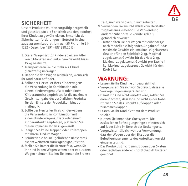 SICHERHEIT Unsere Produkte wurden sorgfältig hergestellt und getestet, um die Sicherheit und den Komfort Ihres Kindes zu gewährleisten. Entspricht den Sicherheitsanforderungen – Getestet in einem zugelassenen Laboratrium gemäß Richtlinie 911292 - Dezember 1991 - EN1888:2012. 1. D ieser Wagen ist für Kinder ab einem Alter von 0 Monaten und mit einem Gewicht bis zu 15 kg bestimmt. 2. T ransportieren Sie nie mehr als 1 Kind gleichzeitig im Wagen. 3. Heben Sie den Wagen niemals an, wenn sich Ihr Kind darin befindet. 4. S ollte der Hersteller Ihres Kinderwagens die Verwendung in Kombination mit einem Kinderwagenaufsatz oder einem Kinderautositz empfehlen, ist die maximale Gewichtsangabe des zusätzlichen Produkts für den Einsatz der Produktkombination maßgeblich. 5. S ollte der Hersteller Ihres Kinderwagens die Verwendung in Kombination mit einem Kinderwagenaufsatz oder einem Kinderautositz empfehlen, platzieren Sie diesen immer zu Ihnen zugewandt. 6. Steigen Sie keine Treppen oder Rolltreppen mit Ihrem Kind im Wagen. 7. B enutzen Sie bei neugeborenen Babys stets die am weitesten zurückgeneigte Position. 8. Stellen Sie immer die Bremse fest, wenn Sie Ihr Kind in den Wagen setzen oder es aus dem Wagen nehmen. Stellen Sie immer die Bremse