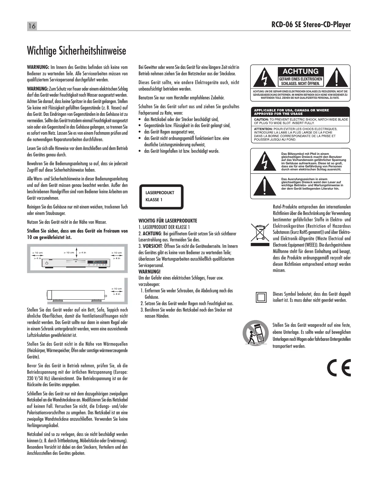 - das Gerät hingefallen ist bzw. beschädigt wurde. Bewahren Sie die Bedienungsanleitung so auf, dass sie jederzeit Zugriff auf diese Sicherheitshinweise haben. Alle Warn- und Sicherheitshinweise in dieser Bedienungsanleitung und auf dem Gerät müssen genau beachtet werden. Außer den beschriebenen Handgriffen sind vom Bediener keine Arbeiten am Gerät vorzunehmen. LASERPRODUKT Stellen Sie sicher, dass um das Gerät ein Freiraum von 10 cm gewährleistet ist. Stellen Sie das Gerät weder auf ein Bett, Sofa, Teppich noch ähnliche Oberflächen, damit die Ventilationsöffnungen nicht verdeckt werden. Das Gerät sollte nur dann in einem Regal oder in einem Schrank untergebracht werden, wenn eine ausreichende Luftzirkulation gewährleistet ist. Stellen Sie das Gerät nicht in die Nähe von Wärmequellen (Heizkörper, Wärmespeicher, Öfen oder sonstige wärmeerzeugende Geräte). Bevor Sie das Gerät in Betrieb nehmen, prüfen Sie, ob die Betriebsspannung mit der örtlichen Netzspannung (Europa: 230 V/50 Hz) übereinstimmt. Die Betriebsspannung ist an der Rückseite des Gerätes angegeben. Schließen Sie das Gerät nur mit dem dazugehörigen zweipoligen Netzkabel an die Wandsteckdose an. Modifizieren Sie das Netzkabel auf keinen Fall. Versuchen Sie nicht, die Erdungs- und/oder Polarisationsvorschriften zu umgehen. Das Netzkabel ist an eine zweipolige Wandsteckdose anzuschließen. Verwenden Sie keine Verlängerungskabel. Netzkabel sind so zu verlegen, dass sie nicht beschädigt werden können (z. B. durch Trittbelastung, Möbelstücke oder Erwärmung). Besondere Vorsicht ist dabei an den Steckern, Verteilern und den Anschlussstellen des Gerätes geboten. ACHTUNG: UM DIE GEFAHR EINES ELEKTRISCHEN SCHLAGES ZU REDUZIEREN, NICHT DIE GEHÄUSEABDECKUNG ENTFERNEN. IM INNERN BEFINDEN SICH KEINE VOM BEDIENER ZU WARTENDEN TEILE. ZIEHEN SIE NUR QUALIFIZIERTES PERSONAL ZU RATE. Das Blitzsymbol mit Pfeil in einem gleichseitigen Dreieck macht den Benutzer auf das Vorhandensein gefährlicher Spannung im Gehäuse aufmerksam. Diese ist so groß, dass sie für eine Gefährdung von Personen durch einen elektrischen Schlag ausreicht. Das Ausrufungszeichen in einem gleichseitigen Dreieck weist den Leser auf wichtige Betriebs- und Wartungshinweise in der dem Gerät beiliegenden Literatur hin. KLASSE 1 Reinigen Sie das Gehäuse nur mit einem weichen, trockenen Tuch oder einem Staubsauger. Nutzen Sie das Gerät nicht in der Nähe von Wasser. ACHTUNG