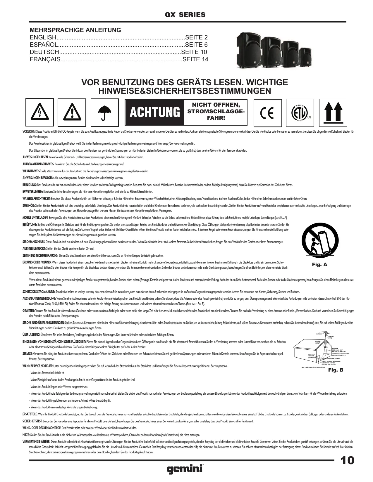 GX SERIES EINLEITUNG Wir beglückwünschen Sie zu Ihrer Wahl eines Lautsprechers aus der Gemini GX-SERIE. Die Lautsprecher sind mit einer limitierten 1-Jahres-Garantie* versehen und sie werden bei richtiger Behandlung und Pflege jahrelang zuverlässig arbeiten. Bitte registrieren Sie Ihr Produkt unter www.geminidj.com. *Es gelten die jeweiligen Gewährleistungsbestimmungen des Landes, wo das Gerät erworben wurde. WARNUNG
