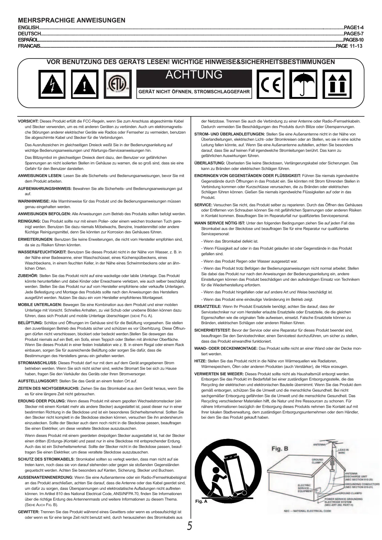 ATIENDA A LAS ADVERTENCIAS: Deben seguirse todas las advertencias sobre este producto que figuran en el manual de instrucciones. SIGA LAS INSTRUCCIONES: Deben seguirse todas las instrucciones del manual. - Si este producto lleva una clavija de corriente alterna polarizada (con un pivote más grueso que otro, tipo inglés), sólo entrará en una posición. Es una medida de seguridad. Si no puede introducir la cla-vija en el enchufe, gírela. En ningún caso debe forzarse. Si sigue sin entrar, un electricista debería cambiar el enchufe. - Si la unidad lleva una clavija con tres pivotes (el tercero corres-ponde a la toma de tierra), sólo entrará en un tipo de enchufe. Se trata de una medida de seguridad. Si el enchufe y la clavija no son compatibles, un electricista deberá cambiar el enchufe. En ningún caso deberá forzarse. PROTECCIÓN DEL CABLE DE CORRIENTE: Los cables de corriente deben protegerse para que nadie los pise ni corran el riesgo de pinzarse por elementos colocados encima o que los aprisionen. Debe prestarse especial atención al cable, al enchufe, a los extensores de cable y al punto por donde el cable sale de la unidad. TIERRA DE LA ANTENA EXTERIOR: Si el producto lleva conectada una antena exterior o sistema de cables, asegúrese de que cuenta con la toma de tierra correspondiente, a fin de proteger la unidad de variaciones de voltaje y cargas de electricidad estática. Existe documentación oficial acerca de la correcta utilización de la toma de tierra y de las medidas de seguridad pertinentes, conexión de los electrodos de descarga y sus requisitos. Véase Figura B. RAYOS: Como protección adicional del producto durante una tormenta eléctrica, o durante periodos prolongados sin usarlo, desenchúfelo de la corriente y desconecte la antena o sistema de cables. De este modo se protegerá el producto de los daños que pueda producir la caída de un rayo o las fluctuaciones de la red eléctrica. LÍNEAS ELÉCTRICAS: Nunca debe situarse un sistema de antena cerca de líneas eléctricas u otros circuitos de corriente. Tampoco debe colocarse en lugares donde pueda caer sobre dichos circuitos eléctricos. Al instalar un sistema de antenización