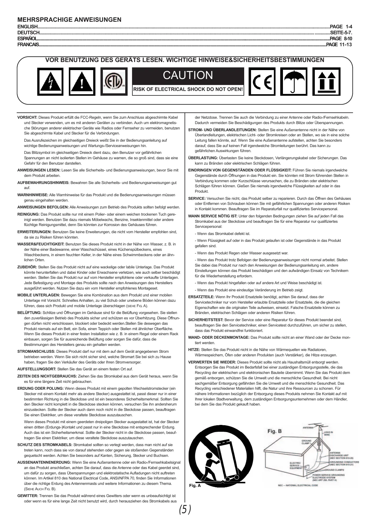 ATIENDA A LAS ADVERTENCIAS: Deben seguirse todas las advertencias sobre este producto que figuran en el manual de instrucciones. SIGA LAS INSTRUCCIONES: Deben seguirse todas las instrucciones del manual. - Si este producto lleva una clavija de corriente alterna polarizada (con un pivote más grueso que otro, tipo inglés), sólo entrará en una posición. Es una medida de seguridad. Si no puede introducir la cla-vija en el enchufe, gírela. En ningún caso debe forzarse. Si sigue sin entrar, un electricista debería cambiar el enchufe. - Si la unidad lleva una clavija con tres pivotes (el tercero corres-ponde a la toma de tierra), sólo entrará en un tipo de enchufe. Se trata de una medida de seguridad. Si el enchufe y la clavija no son compatibles, un electricista deberá cambiar el enchufe. En ningún caso deberá forzarse. PROTECCIÓN DEL CABLE DE CORRIENTE: Los cables de corriente deben protegerse para que nadie los pise ni corran el riesgo de pinzarse por elementos colocados encima o que los aprisionen. Debe prestarse especial atención al cable, al enchufe, a los extensores de cable y al punto por donde el cable sale de la unidad. TIERRA DE LA ANTENA EXTERIOR: Si el producto lleva conectada una antena exterior o sistema de cables, asegúrese de que cuenta con la toma de tierra correspondiente, a fin de proteger la unidad de variaciones de voltaje y cargas de electricidad estática. Existe documentación oficial acerca de la correcta utilización de la toma de tierra y de las medidas de seguridad pertinentes, conexión de los electrodos de descarga y sus requisitos. Véase Figura B. RAYOS: Como protección adicional del producto durante una tormenta eléctrica, o durante periodos prolongados sin usarlo, desenchúfelo de la corriente y desconecte la antena o sistema de cables. De este modo se protegerá el producto de los daños que pueda producir la caída de un rayo o las fluctuaciones de la red eléctrica. LÍNEAS ELÉCTRICAS: Nunca debe situarse un sistema de antena cerca de líneas eléctricas u otros circuitos de corriente. Tampoco debe colocarse en lugares donde pueda caer sobre dichos circuitos eléctricos. Al instalar un sistema de antenización exterior, debe tomarse la extrema precaución de no tocar dichas líneas eléctricas,