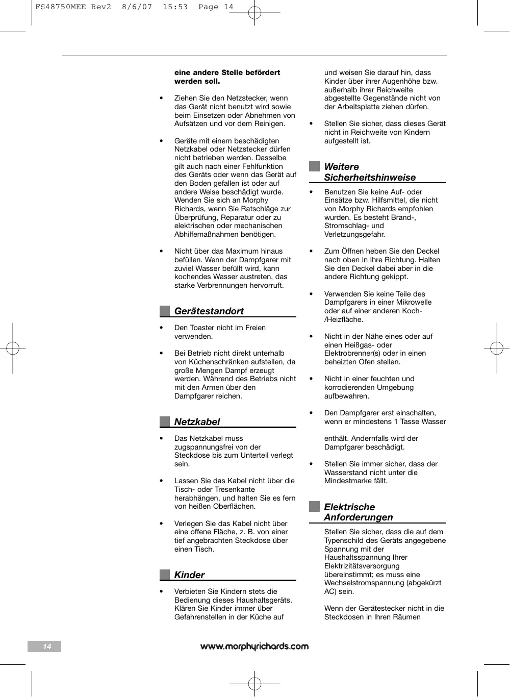 Vor dem Verlassen des Werks werden alle Morphy Richards Produkte geprüft. Sollte einmal der Fall auftreten, dass sich ein Gerät innerhalb der Garantiezeit als fehlerhaft erweist, wenden Sie sich bitte an unsere Service-Hotline (01805-398346 – 12 Cent pro Minute). Falls das Gerät während der 2jährigen Garantielaufzeit aus welchem Grund auch immer ausgetauscht wird, wird zur Berechnung der Restgarantie für das neue Gerät das OriginalKaufdatum zugrunde gelegt. Aus diesem Grunde ist es besonders wichtig, den Original-Kaufbeleg bzw. die Rechnung aufzubewahren, um das Datum des ursprünglichen Kaufs nachweisen zu können. Damit die 2-jährige Garantie geltend gemacht werden kann, muss das Gerät im Einklang mit den Anweisungen des Herstellers benutzt worden sein. Beispielsweise muss das Gerät entkalkt worden sein und gemäß den Anweisungen gereinigt werden. Morphy Richards übernimmt keine Verpflichtung zur Reparatur oder zum Austausch der Waren im Rahmen der Garantiebedingungen, wenn: