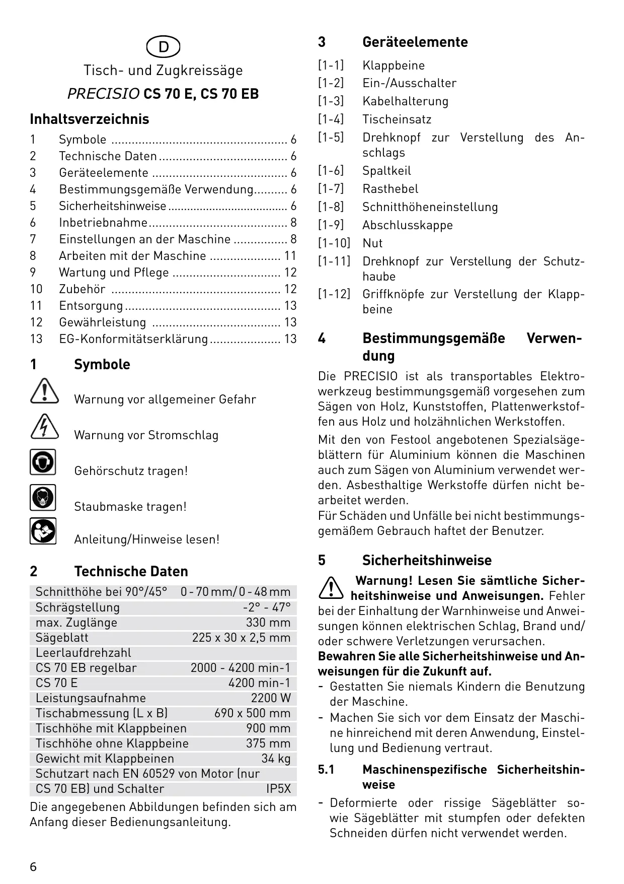 Technische Daten Schnitthöhe bei 90°/45° 0 - 70 mm/ 0 - 48 mm Schrägstellung -2° - 47° max. Zuglänge 330 mm Sägeblatt 225 x 30 x 2,5 mm Leerlaufdrehzahl CS 70 EB regelbar 2000 - 4200 min-1 CS 70 E 4200 min-1 Leistungsaufnahme 2200 W Tischabmessung (L x B) 690 x 500 mm Tischhöhe mit Klappbeinen 900 mm Tischhöhe ohne Klappbeine 375 mm Gewicht mit Klappbeinen 34 kg Schutzart nach EN 60529 von Motor (nur CS 70 EB) und Schalter IP5X Die angegebenen Abbildungen befinden sich am Anfang dieser Bedienungsanleitung.