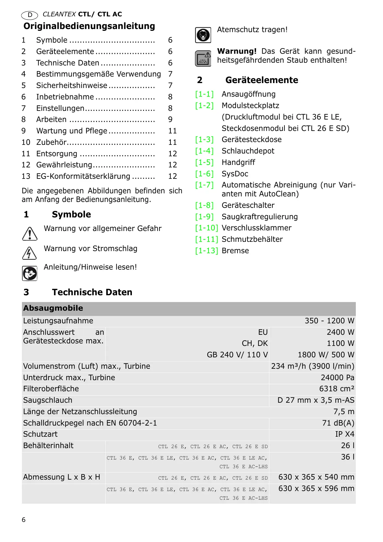 2400 W CH, DK 1100 W GB 240 V/ 110 V 1800 W/ 500 W 234 m³/h (3900 l/min) Volumenstrom (Luft) max., Turbine Unterdruck max., Turbine Filteroberfläche Saugschlauch Länge der Netzanschlussleitung Schalldruckpegel nach EN 60704-2-1 Schutzart Behälterinhalt CTL 26 E, CTL 26 E AC, CTL 26 E SD 24000 Pa 6318 cm² D 27 mm x 3,5 m-AS 7,5 m 71 dB(A) IP X4 26 l CTL 36 E, CTL 36 E LE, CTL 36 E AC, CTL 36 E LE AC, 36 l