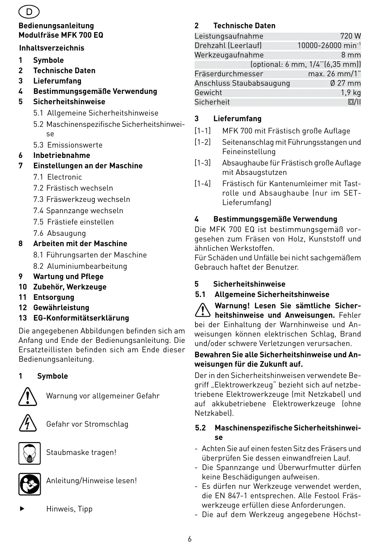 Bestimmungsgemäße Verwendung Die MFK 700 EQ ist bestimmungsgemäß vorgesehen zum Fräsen von Holz, Kunststoff und ähnlichen Werkstoffen. Für Schäden und Unfälle bei nicht sachgemäßem Gebrauch haftet der Benutzer. Die angegebenen Abbildungen befinden sich am Anfang und Ende der Bedienungsanleitung. Die Ersatzteillisten befinden sich am Ende dieser Bedienungsanleitung.