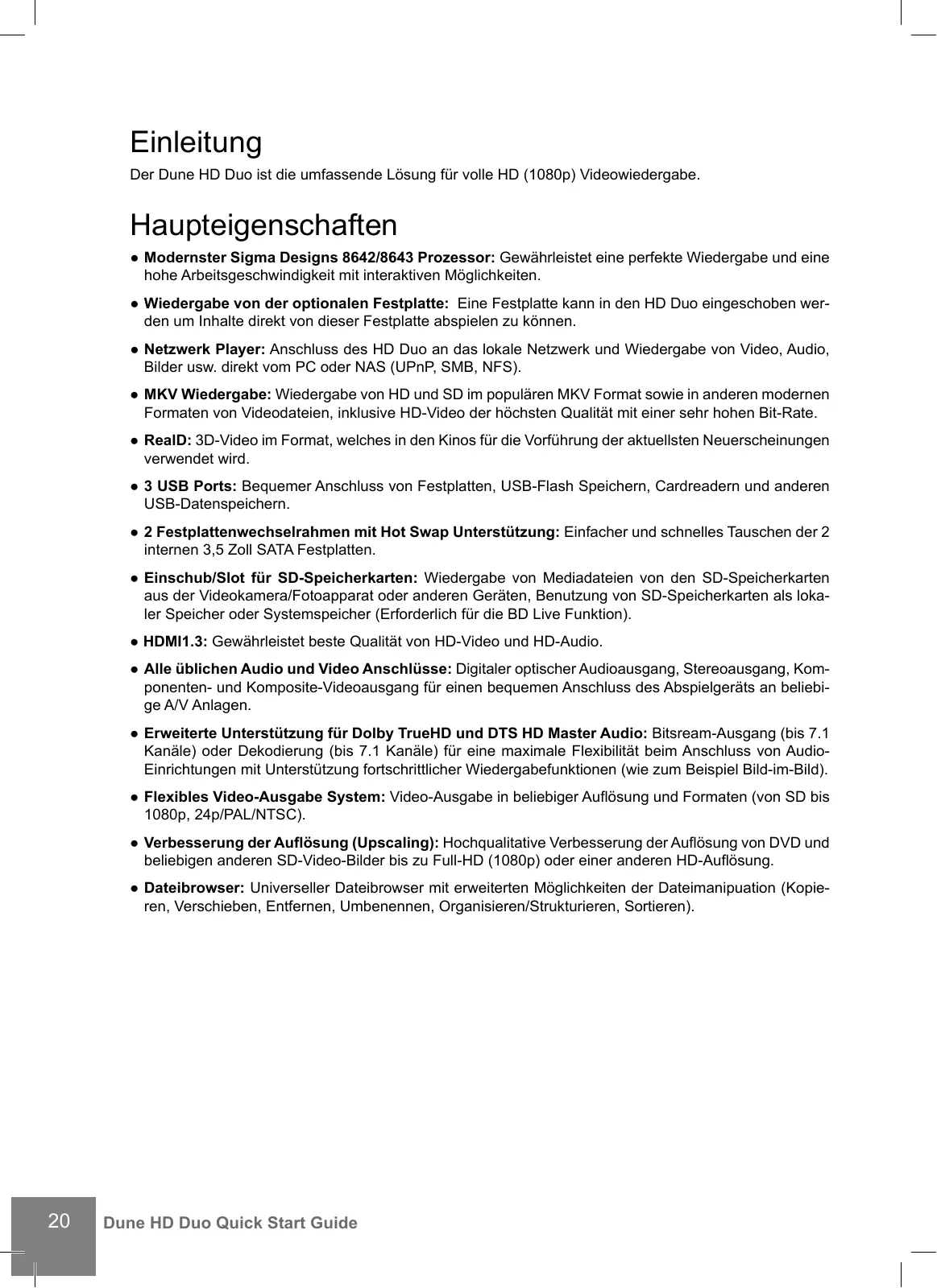 Einleitung Der Dune HD Duo ist die umfassende Lösung für volle HD (1080p) Videowiedergabe. Haupteigenschaften ● Modernster Sigma Designs 8642/8643 Prozessor: Gewährleistet eine perfekte Wiedergabe und eine hohe Arbeitsgeschwindigkeit mit interaktiven Möglichkeiten. ● Wiedergabe von der optionalen Festplatte: Eine Festplatte kann in den HD Duo eingeschoben werden um Inhalte direkt von dieser Festplatte abspielen zu können. ● Netzwerk Player: Anschluss des HD Duo an das lokale Netzwerk und Wiedergabe von Video, Audio, Bilder usw. direkt vom PC oder NAS (UPnP, SMB, NFS). ● MKV Wiedergabe: Wiedergabe von HD und SD im populären MKV Format sowie in anderen modernen Formaten von Videodateien, inklusive HD-Video der höchsten Qualität mit einer sehr hohen Bit-Rate. ● RealD: 3D-Video im Format, welches in den Kinos für die Vorführung der aktuellsten Neuerscheinungen verwendet wird. ● 3 USB Ports: Bequemer Anschluss von Festplatten, USB-Flash Speichern, Cardreadern und anderen USB-Datenspeichern. ● 2 Festplattenwechselrahmen mit Hot Swap Unterstützung: Einfacher und schnelles Tauschen der 2 internen 3,5 Zoll SATA Festplatten. ● Einschub/Slot für SD-Speicherkarten: Wiedergabe von Mediadateien von den SD-Speicherkarten aus der Videokamera/Fotoapparat oder anderen Geräten, Benutzung von SD-Speicherkarten als lokaler Speicher oder Systemspeicher (Erforderlich für die BD Live Funktion). ● HDMI1.3: Gewährleistet beste Qualität von HD-Video und HD-Audio. ● Alle üblichen Audio und Video Anschlüsse: Digitaler optischer Audioausgang, Stereoausgang, Komponenten- und Komposite-Videoausgang für einen bequemen Anschluss des Abspielgeräts an beliebige A/V Anlagen. ● Erweiterte Unterstützung für Dolby TrueHD und DTS HD Master Audio: Bitsream-Ausgang (bis 7.1 Kanäle) oder Dekodierung (bis 7.1 Kanäle) für eine maximale Flexibilität beim Anschluss von AudioEinrichtungen mit Unterstützung fortschrittlicher Wiedergabefunktionen (wie zum Beispiel Bild-im-Bild). ● Flexibles Video-Ausgabe System: Video-Ausgabe in beliebiger Auflösung und Formaten (von SD bis 1080p, 24p/PAL/NTSC). ● Verbesserung der Auflösung (Upscaling): Hochqualitative Verbesserung der Auflösung von DVD und beliebigen anderen SD-Video-Bilder bis zu Full-HD (1080p) oder einer anderen HD-Auflösung. ● Dateibrowser: Universeller Dateibrowser mit erweiterten Möglichkeiten der Dateimanipuation (Kopieren, Verschieben, Entfernen, Umbenennen, Organisieren/Strukturieren, Sortieren).