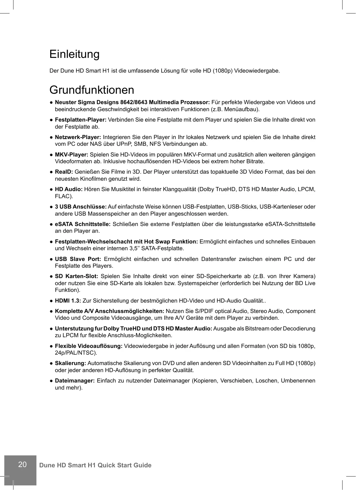 Einleitung Der Dune HD Smart H1 ist die umfassende Lösung für volle HD (1080p) Videowiedergabe. Grundfunktionen ● Neuster Sigma Designs 8642/8643 Multimedia Prozessor: Für perfekte Wiedergabe von Videos und beeindruckende Geschwindigkeit bei interaktiven Funktionen (z.B. Menüaufbau). ● Festplatten-Player: Verbinden Sie eine Festplatte mit dem Player und spielen Sie die Inhalte direkt von der Festplatte ab. ● Netzwerk-Player: Integrieren Sie den Player in Ihr lokales Netzwerk und spielen Sie die Inhalte direkt vom PC oder NAS über UPnP, SMB, NFS Verbindungen ab. ● MKV-Player: Spielen Sie HD-Videos im populären MKV-Format und zusätzlich allen weiteren gängigen Videoformaten ab. Inklusive hochauflösenden HD-Videos bei extrem hoher Bitrate. ● RealD: Genießen Sie Filme in 3D. Der Player unterstützt das topaktuelle 3D Video Format, das bei den neuesten Kinofilmen genutzt wird. ● HD Audio: Hören Sie Musiktitel in feinster Klangqualität (Dolby TrueHD, DTS HD Master Audio, LPCM, FLAC). ● 3 USB Anschlüsse: Auf einfachste Weise können USB-Festplatten, USB-Sticks, USB-Kartenleser oder andere USB Massenspeicher an den Player angeschlossen werden. ● eSATA Schnittstelle: Schließen Sie externe Festplatten über die leistungsstarke eSATA-Schnittstelle an den Player an. ● Festplatten-Wechselschacht mit Hot Swap Funktion: Ermöglicht einfaches und schnelles Einbauen und Wechseln einer internen 3,5’’ SATA-Festplatte. ● USB Slave Port: Ermöglicht einfachen und schnellen Datentransfer zwischen einem PC und der Festplatte des Players. ● SD Karten-Slot: Spielen Sie Inhalte direkt von einer SD-Speicherkarte ab (z.B. von Ihrer Kamera) oder nutzen Sie eine SD-Karte als lokalen bzw. Systemspeicher (erforderlich bei Nutzung der BD Live Funktion). ● HDMI 1.3: Zur Sicherstellung der bestmöglichen HD-Video und HD-Audio Qualität.. ● Komplette A/V Anschlussmöglichkeiten: Nutzen Sie S/PDIF optical Audio, Stereo Audio, Component Video und Composite Videoausgänge, um Ihre A/V Geräte mit dem Player zu verbinden. ● Unterstutzung fur Dolby TrueHD und DTS HD Master Audio: Ausgabe als Bitstream oder Decodierung zu LPCM fur flexible Anschluss-Moglichkeiten. ● Flexible Videoauflösung: Videowiedergabe in jeder Auflösung und allen Formaten (von SD bis 1080p, 24p/PAL/NTSC). ● Skalierung: Automatische Skalierung von DVD und allen anderen SD Videoinhalten zu Full HD (1080p) oder jeder anderen HD-Auflösung in perfekter Qualität. ● Dateimanager: Einfach zu nutzender Dateimanager (Kopieren, Verschieben, Loschen, Umbenennen und mehr).