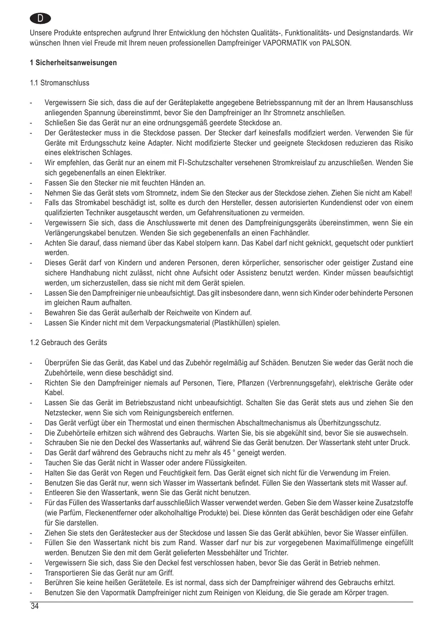 Aus ersichtlichen Gründen übernimmt der Hersteller keine Verantwortung fur Beschädigungen bzw. Verletzungen, die an Gegenständen, Materialien, Personen, Tieren oder Pflanzen aufgrund des heißen Dampfs oder aufgrund der fehlerhaften Benutzung des Geräts entstehen.