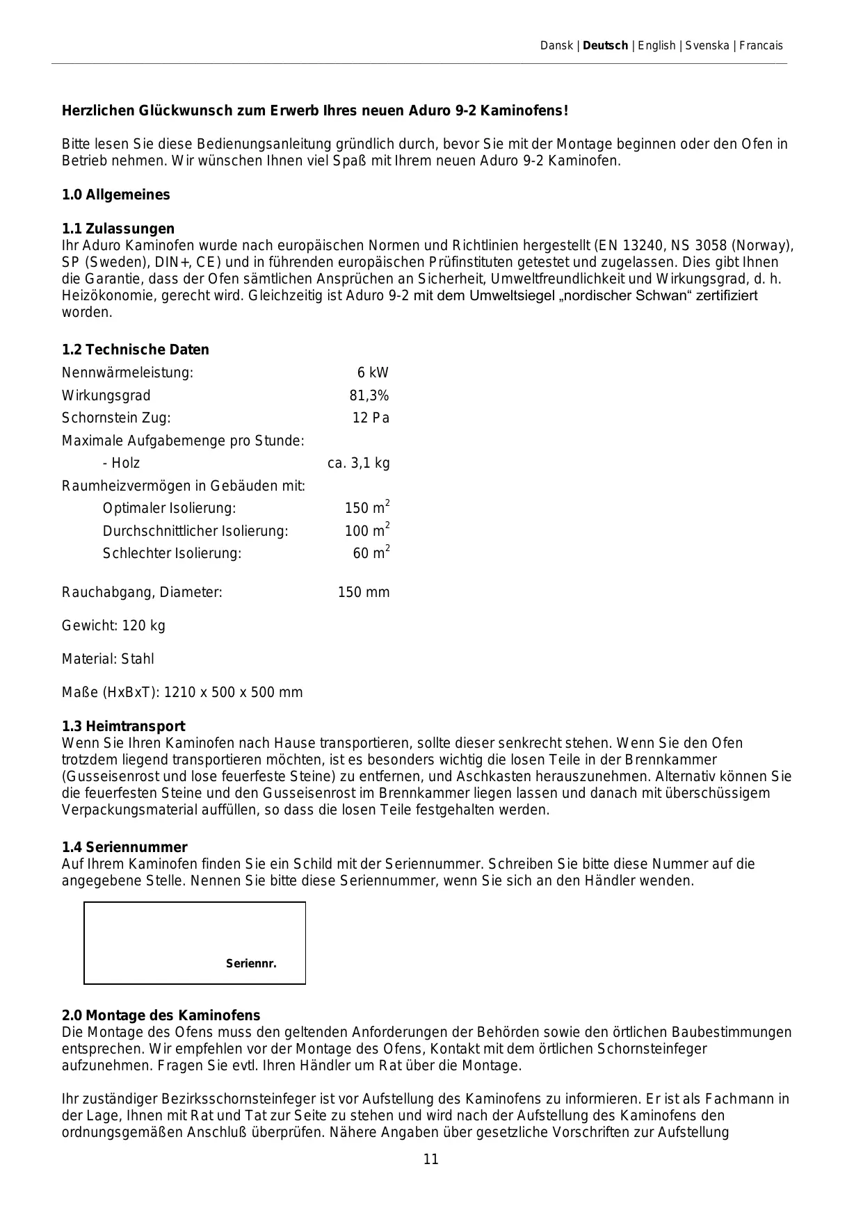 Auf Ihrem Kaminofen finden Sie ein Schild mit der Seriennummer. Schreiben Sie bitte diese Nummer auf die angegebene Stelle. Nennen Sie bitte diese Seriennummer, wenn Sie sich an den Händler wenden. Seriennr.