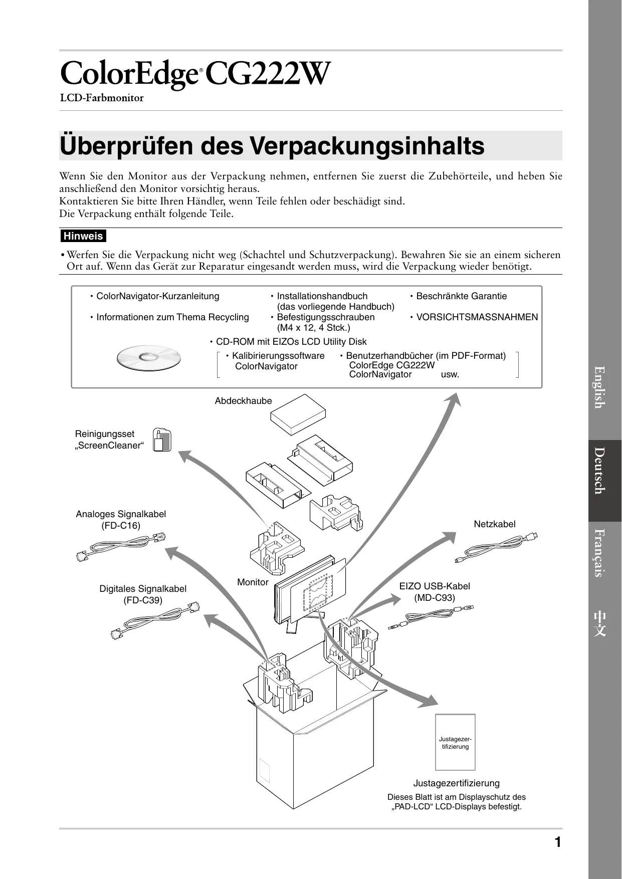 ColorEdge CG222W LCD-Farbmonitor Überprüfen des Verpackungsinhalts Wenn Sie den Monitor aus der Verpackung nehmen, entfernen Sie zuerst die Zubehôrteile, und heben Sie anschlieRend den Monitor vorsichtig heraus. Kontaktieren Sie bitte Ihren Händler, wenn Teile fehlen oder beschädigt sind. Die Verpackung enthält folgende Teile. + Werfen Sie die Verpackung nicht weg (Schachtel und Schutzverpackung). Bewahren Sie sie an einem sicheren Ort auf. Wenn das Gerät zur Reparatur eingesandt werden muss, wird die Verpackung wieder benôtigt. + ColorNavigator-Kurzanleitung + Installationshandbuch + Beschränkte Garantie (das vorliegende Handbuch) + Informationen zum Thema Recycling + Befestigungsschrauben + VORSICHTSMASSNAHMEN (M4 x 12, 4 Sick.) + CD-ROM mit EIZOs LCD Utility Disk æ - Kalibirierungssoftware + Benutzerhandbücher (im PDF-Format) ColorNavigator ColorEdge CG222W ColorNavigator USW. Abdeckhaube 2 Reinigungsset »ScreenCleaner* S Analoges Signalkabel (FD-C16) ysBux