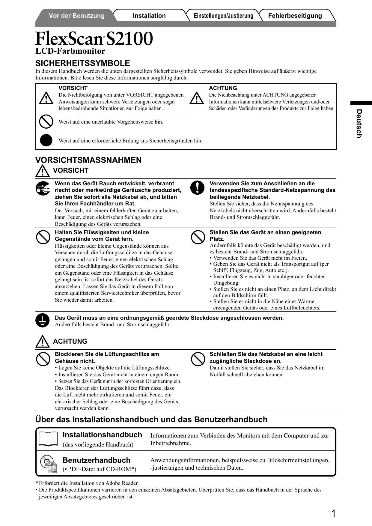 Vor der Benui Installation Einstellungen/Justierung FlexScan S2100 LCD-Farbmonitor SICHERHEITSSYMBOLE In diesem Handbuch werden die unten dargestellten Sicherheitssymbole verwendet. Sie geben Hinweise auf äuBerst wichtige Informationen. Bitte lesen Sie diese Informationen sorgfältig durch. VORSICHT. ACHTUNG Die Nichtbefolgung von unter VORSICHT angegebenen Die Nichbeachtung unter ACHTUNG angegebener À Anweisungen kann schwere Verletzungen oder sogar À Informationen kann mittelschwere Verletzungen und/oder Iebensbedrohende Situationen zur Folge haben. Schäden oder Veränderungen des Produkts zur Folge haben. O Weist auf eine unerlaubte Vorgehensweise hin. @ Weist auf eine erforderliche Erdung aus Sicherheitsgründen hin. VORSICHTSMASSNAHMEN VAN VORSICHT Wenn das Gerät Rauch entwickelt, verbrannt Verwenden Sie zum Anschliefen an die riecht oder merkwürdige Geräusche produziert, landesspezifische Standard-Netzspannung das ziehen Sie sofort alle Netzkabel ab, und bitten beiliegende Netzkabel. Sie Ihren Fachhändler um Rat. Stellen Sie sicher, dass die Nennspannung des Der Versuch, mit einem fehlerhaften Gerät zu arbeiten, Netzkabels nicht überschritten wird. Andernfalls besteht kann Feuer, einen elektrischen Schlag oder eine Brand- und Stromschlaggefahr. Beschädigung des Geräts verursachen. Halten Sie Flüssigkeiten und kleine Stellen Sie das Gerät an einen geeigneten O Gegenstände vom Gerät fern. O Platz. Flüssigkeiten oder kleine Gegenstände kônnen aus Andernfalls knnte das Gerät beschädigt werden, und Versehen durch die Lüftungsschlitze in das Gehäuse es besteht Brand- und Stromschlaggefahr. gelangen und somit Feuer, einen elektrischen Schlag + Verwenden Sie das Gerät nicht im Freien. + Geben Sie das Gerät nicht als Transportgut auf (per Schiff, Flugzeug, Zug, Auto etc.). + Installieren Sie es nicht in staubiger oder feuchter Umgebung. + Stellen Sie es nicht an einen Platz, an dem Licht direkt inem ‘rien Se auf den Bildschirm fällt. Sie wieder damit arbeiten. + Stellen Sie es nicht in die Nähe eines Wärme erzeugenden Geräts oder eines Luftbefeuchters. oder eine Beschädigung des Geräts verursachen. Sollte ein Gegenstand oder eine Flüssigkeit in das Gehäuse gelangt sein, ist sofort das Netzkabel des Geräts abzuziehen. Lassen Sie das Gerät in diesem Fall von einem qualifizierten Servicetechniker überprüfen, bevor Das Gerät muss an eine ordnungsgemäR geerdete Steckdose angeschlossen werden. Andernfalls besteht Brand- und Stromschlaggefahr. VAN ACHTUNG Blockieren Sie die Lüftungsschlitze am SchlieSen Sie das Netzkabel an eine leicht O Gehäuse nicht. O zugängliche Steckdose an. + Legen Sie keine Objekte auf die Lüftungsschlitze. Damit stellen Sie sicher, dass Sie das Netzkabel im + Installieren Sie das Gerät nicht in einem engen Raum. Notfall schnell abziehen kônnen. + Setzen Sie das Gerät nur in der korrekten Orientierung ein. Das Blockieren der Lüftungsschlitze führt dazu, dass die Luft nicht mehr zirkulieren und somit Feuer, ein elektrischer Schlag oder eine Beschädigung des Geräts verursacht werden kann. Über das Installationshandbuch und das Benutzerhandbuch [I] Installationshandbuch |Informationen zum Verbinden des Monitors mit dem Computer und zur (das vorliegende Handbuch) Inbetriebnahme. © Benutzerhandbuch Anwendungsinformationen, beispielsweise zu Bildschirmeinstellungen, ( PDF-Datei auf CD-ROM*) -justierungen und technischen Daten.