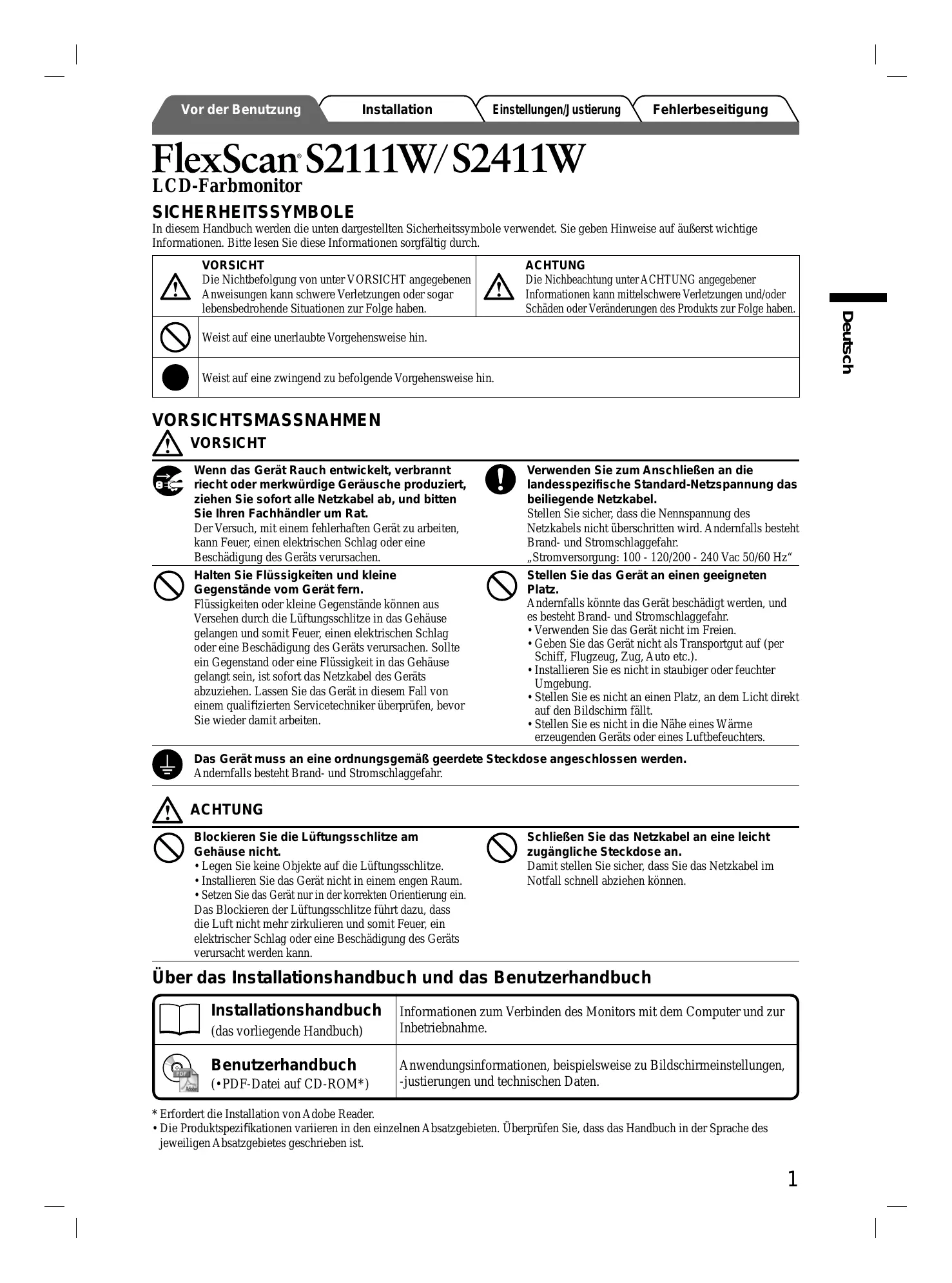 Vor der Benutzung Installation Einstellungen/ ustierung FlexScan S2111W/S2411W LCD -Farbmonitor SICHERHEITSSYMBOLE In diesem Handbuch werden die unten dargestellten Sicherheitssymbole verwendet. Sie geben Hinweise auf äuRerst wichtige Informationen. Bitte lesen Sie diese Informationen sorgfältig durch.