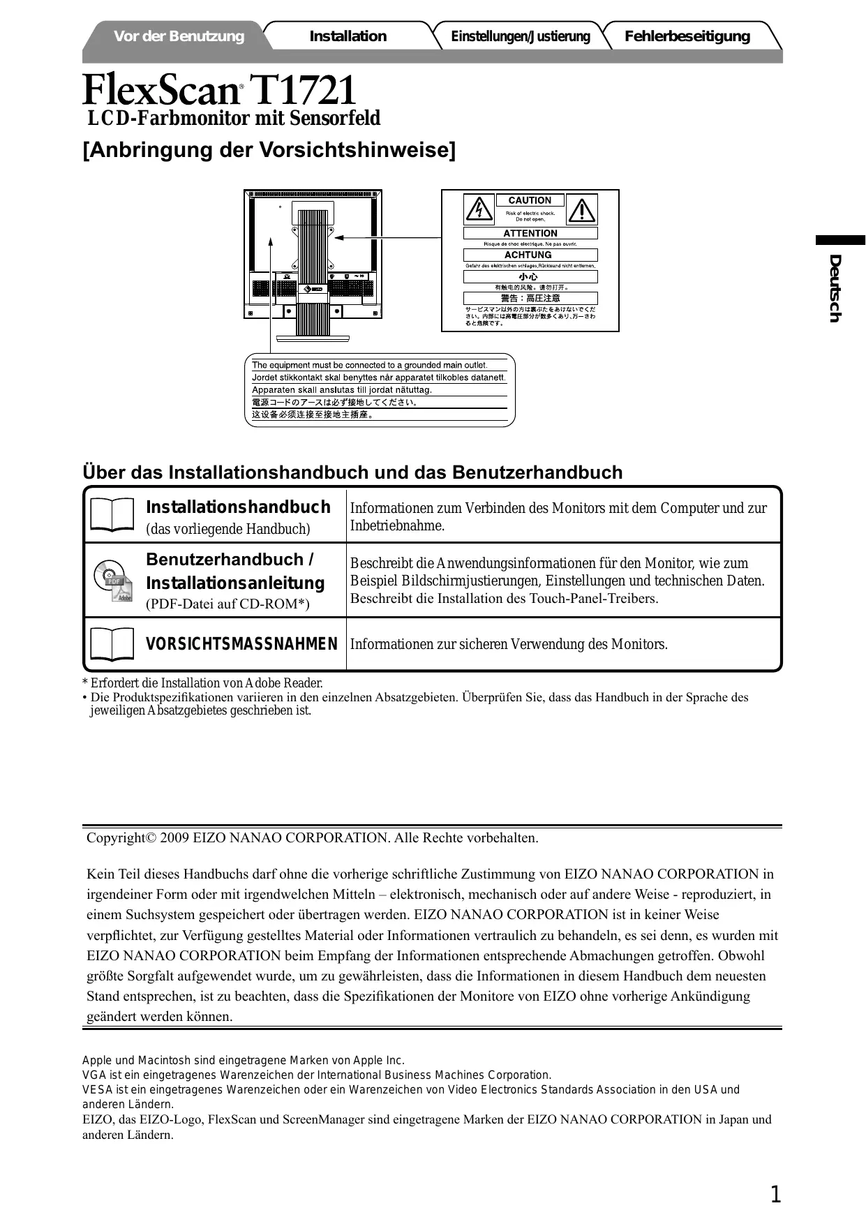Vor der Benutzung Installation instellungen/ ustierung Fehlerbeseitigung FlexScan T1721 LCD-Farbmonitor mit Sensorfeld [Anbringung der Vorsichtshinweise] A CAUTION Â [ ATTENTION ] ACHTUNG ERA LA