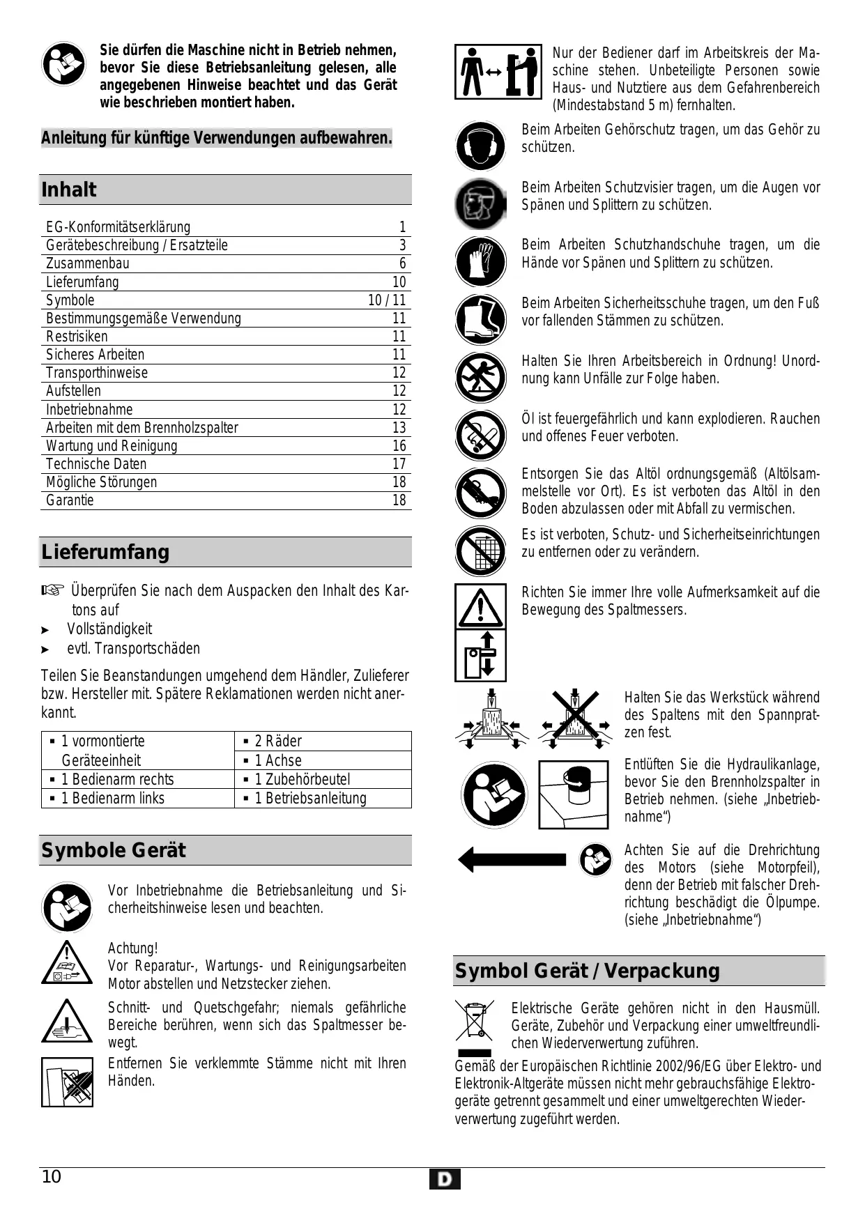 Sie dürfen die Maschine nicht in Betrieb nehmen, bevor Sie diese Betriebsanleitung gelesen, alle angegebenen Hinweise beachtet und das Gerät wie beschrieben montiert haben. Nur der Bediener darf im Arbeitskreis der Maschine stehen. Unbeteiligte Personen sowie Haus- und Nutztiere aus dem Gefahrenbereich (Mindestabstand 5 m) fernhalten. Anleitung für künftige Verwendungen aufbewahren. Beim Arbeiten Gehörschutz tragen, um das Gehör zu schützen. Inhalt Beim Arbeiten Schutzvisier tragen, um die Augen vor Spänen und Splittern zu schützen. EG-Konformitätserklärung Gerätebeschreibung / Ersatzteile Zusammenbau Lieferumfang Symbole Bestimmungsgemäße Verwendung Restrisiken Sicheres Arbeiten Transporthinweise Aufstellen Inbetriebnahme Arbeiten mit dem Brennholzspalter Wartung und Reinigung Technische Daten Mögliche Störungen Garantie
