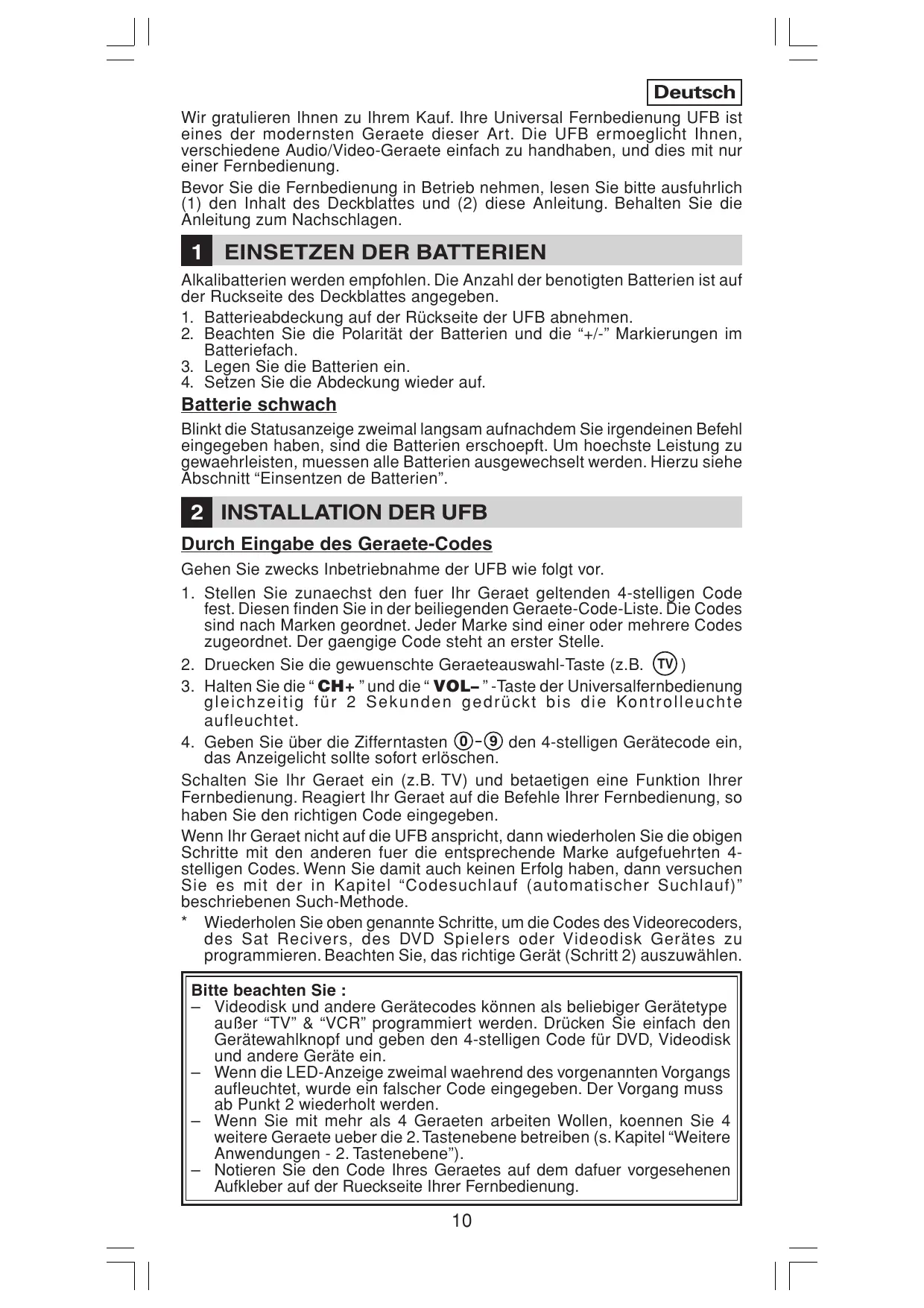 Deutsch Wir gratulieren Ihnen zu Ihrem Kauf. Ihre Universal Fernbedienung UFB ist eines der modernsten Geraete dieser Art. Die UFB ermoeglicht Ihnen, verschiedene Audio/Video-Geraete einfach zu handhaben, und dies mit nur einer Fernbedienung. Bevor Sie die Fernbedienung in Betrieb nehmen, lesen Sie bitte ausfuhrlich (1) den Inhalt des Deckblattes und (2) diese Anleitung. Behalten Sie die Anleitung zum Nachschlagen.