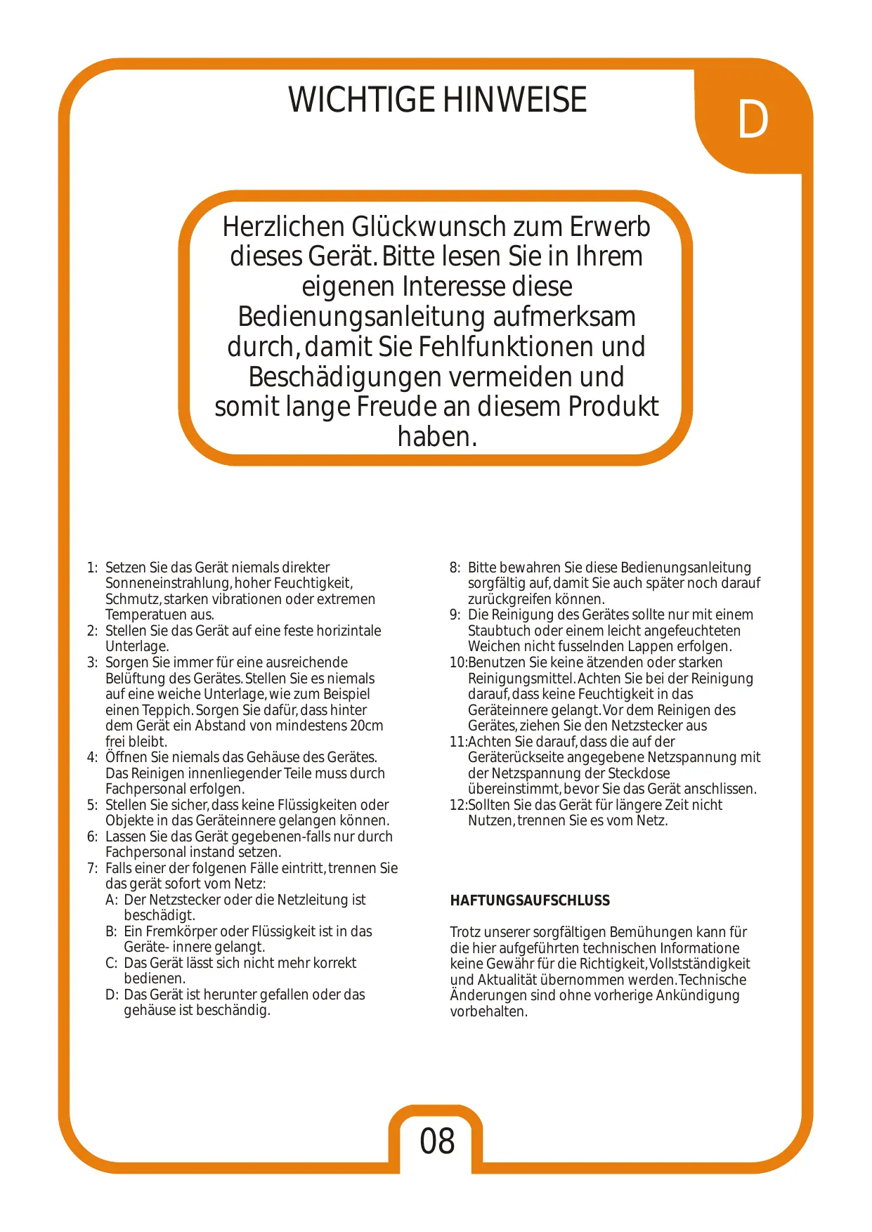 Herzlichen Glückwunsch zum Erwerb dieses Gerät. Bitte lesen Sie in Ihrem eigenen Interesse diese Bedienungsanleitung aufmerksam durch, damit Sie Fehlfunktionen und Beschädigungen vermeiden und somit lange Freude an diesem Produkt haben. 1: Setzen Sie das Gerät niemals direkter Sonneneinstrahlung, hoher Feuchtigkeit, Schmutz, starken vibrationen oder extremen Temperatuen aus. 2: Stellen Sie das Gerät auf eine feste horizintale Unterlage. 3: Sorgen Sie immer für eine ausreichende Belüftung des Gerätes. Stellen Sie es niemals auf eine weiche Unterlage, wie zum Beispiel einen Teppich. Sorgen Sie dafür, dass hinter dem Gerät ein Abstand von mindestens 20cm frei bleibt. 4: Öffnen Sie niemals das Gehäuse des Gerätes. Das Reinigen innenliegender Teile muss durch Fachpersonal erfolgen. 5: Stellen Sie sicher, dass keine Flüssigkeiten oder Objekte in das Geräteinnere gelangen können. 6: Lassen Sie das Gerät gegebenen-falls nur durch Fachpersonal instand setzen. 7: Falls einer der folgenen Fälle eintritt, trennen Sie das gerät sofort vom Netz: A: Der Netzstecker oder die Netzleitung ist beschädigt. B: Ein Fremkörper oder Flüssigkeit ist in das Geräte- innere gelangt. C: Das Gerät lässt sich nicht mehr korrekt bedienen. D: Das Gerät ist herunter gefallen oder das gehäuse ist beschändig. 8: Bitte bewahren Sie diese Bedienungsanleitung sorgfältig auf, damit Sie auch später noch darauf zurückgreifen können. 9: Die Reinigung des Gerätes sollte nur mit einem Staubtuch oder einem leicht angefeuchteten Weichen nicht fusselnden Lappen erfolgen. 10:Benutzen Sie keine ätzenden oder starken Reinigungsmittel. Achten Sie bei der Reinigung darauf, dass keine Feuchtigkeit in das Geräteinnere gelangt. Vor dem Reinigen des Gerätes, ziehen Sie den Netzstecker aus 11:Achten Sie darauf, dass die auf der Geräterückseite angegebene Netzspannung mit der Netzspannung der Steckdose übereinstimmt, bevor Sie das Gerät anschlissen. 12:Sollten Sie das Gerät für längere Zeit nicht Nutzen, trennen Sie es vom Netz. HAFTUNGSAUFSCHLUSS Trotz unserer sorgfältigen Bemühungen kann für die hier aufgeführten technischen Informatione keine Gewähr für die Richtigkeit, Vollstständigkeit und Aktualität übernommen werden. Technische Änderungen sind ohne vorherige Ankündigung vorbehalten.