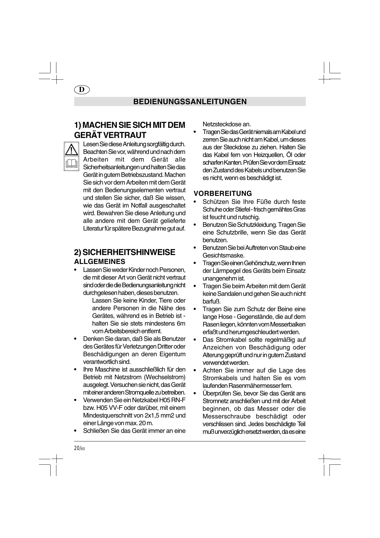 Cualquier persona, antes de utilizar la cortacéspedes, tiene que leer atentamente el presente manual de instrucciones y mantenimiento y familiarizarse bien con los mandos para un empleo correcto de la cortacéspedes. Qualquer pessoa que utilize a corta relvas, deve primeiramente, ler com atenção o manual de instruções e manutenção e familiarizarse completamente com os comandos para um uso correcto uso da corta relvas. Sachez que l'utilisateur est responsable des accidents ou dangers subis par des tiers ou infligés à des biens. Votre machine est conçue pour être utilisée sur courant alternatif (secteur) uniquement. Ne tentez pas de l'utiliser sur un autre type de courant. Utiliser un câble d'alimentation de type H05 RN-F, H05 VV-F ou supérieur, avec une section minimale de 2x1,5 mm2 et une longueur maxi de 20 m.