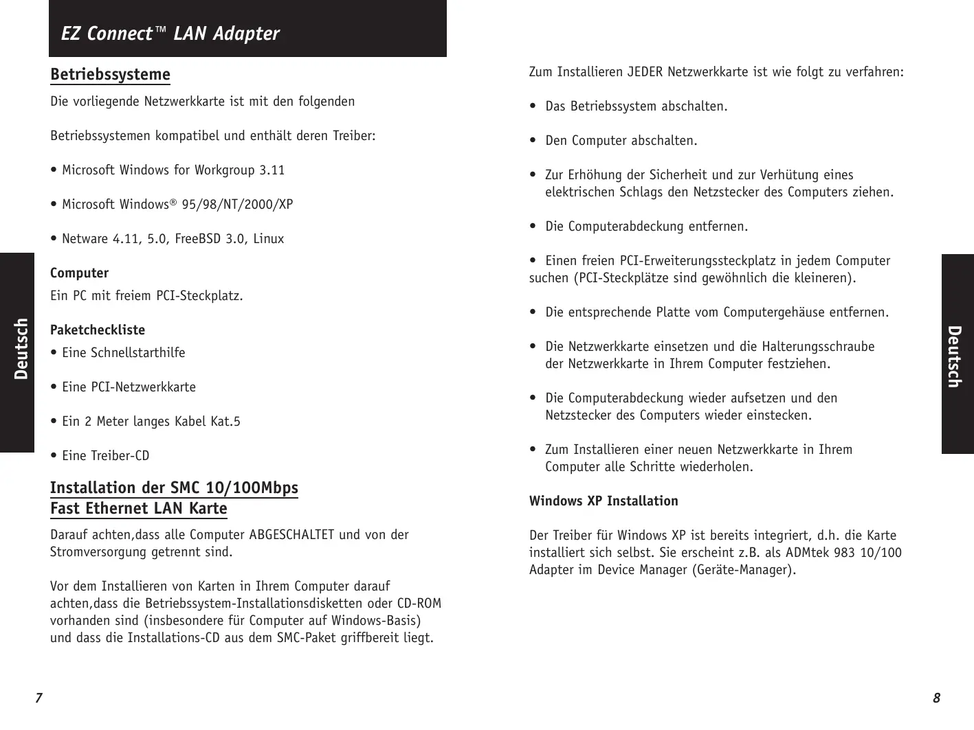 Deutsch EZ Connect" LAN Adapter Betriebssysteme Die vorliegende Netzwerkkarte ist mit den folgenden Betriebssystemen kompatibel und enthält deren Treiber: + Microsoft Windows for Workgroup 3.11 + Microsoft Windows® 95/98/NT/2000/XP + Netware 4.11, 5.0, FreeBSD 3.0, Linux Computer Ein PC mit freiem PCI-Steckplatz. Paketcheckliste + Eine Schnellstarthilfe + Eine PCI-Netzwerkkarte + Ein 2 Meter Langes Kabel Kat.5 + Eine Treiber-CD Installation der SMC 10/100Mbps Fast Ethernet LAN Karte Darauf achten,dass alle Computer ABGESCHALTET und von der Stromversorgung getrennt sind. Vor dem Installieren von Karten in Ihrem Computer darauf achten,dass die Betriebssystem-Installationsdisketten oder CD-ROM vorhanden sind (insbesondere für Computer auf Windows-Basis) und dass die Installations-CD aus dem SMC-Paket griffbereit Liegt. Zum Installieren JEDER Netzwerkkarte ist wie folgt zu verfahren: + Das Betriebssystem abschalten. + Den Computer abschalten. + Zur Erhôhung der Sicherheit und zur Verhütung eines elektrischen Schlags den Netzstecker des Computers ziehen. + Die Computerabdeckung entfernen. + Einen freien PCI-Erweiterungssteckplatz in jedem Computer suchen (PCI-Steckplätze sind gewühnlich die kleineren). + Die entsprechende Platte vom Computergehäuse entfernen. + Die Netzwerkkarte einsetzen und die Halterungsschraube der Netzwerkkarte in Ihrem Computer festziehen. + Die Computerabdeckung wieder aufsetzen und den Netzstecker des Computers wieder einstecken. + Zum Installieren einer neuen Netzwerkkarte in Ihrem Computer alle Schritte wiederholen. Windows XP Installation Der Treiber für Windows XP ist bereits integriert, d.h. die Karte installiert sich selbst. Sie erscheint z.B. als ADMtek 983 10/100 Adapter im Device Manager (Geräte-Manager). ypsin2q