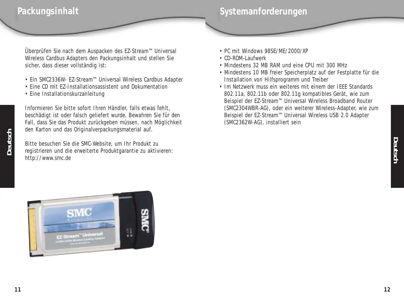 - Eine CD mit EZ-Installationsassistent und Dokumentation + Eine Installationskurzanleitung Informieren Sie bitte sofort Ihren Händler, falls etwas fehit, beschädigt ist oder falsch geliefert wurde. Bewahren Sie für den Fall, dass Sie das Produkt zurückgeben müssen, nach Môglichkeit den Karton und das Originalverpackungsmaterial auf. Bitte besuchen Sie die SMC-Website, um Ihr Produkt zu registrieren und die erweiterte Produktgarantie zu aktivieren: http://www.smc.de Systemanforderungen + PC mit Windows 98SE/ ME/2000/ XP