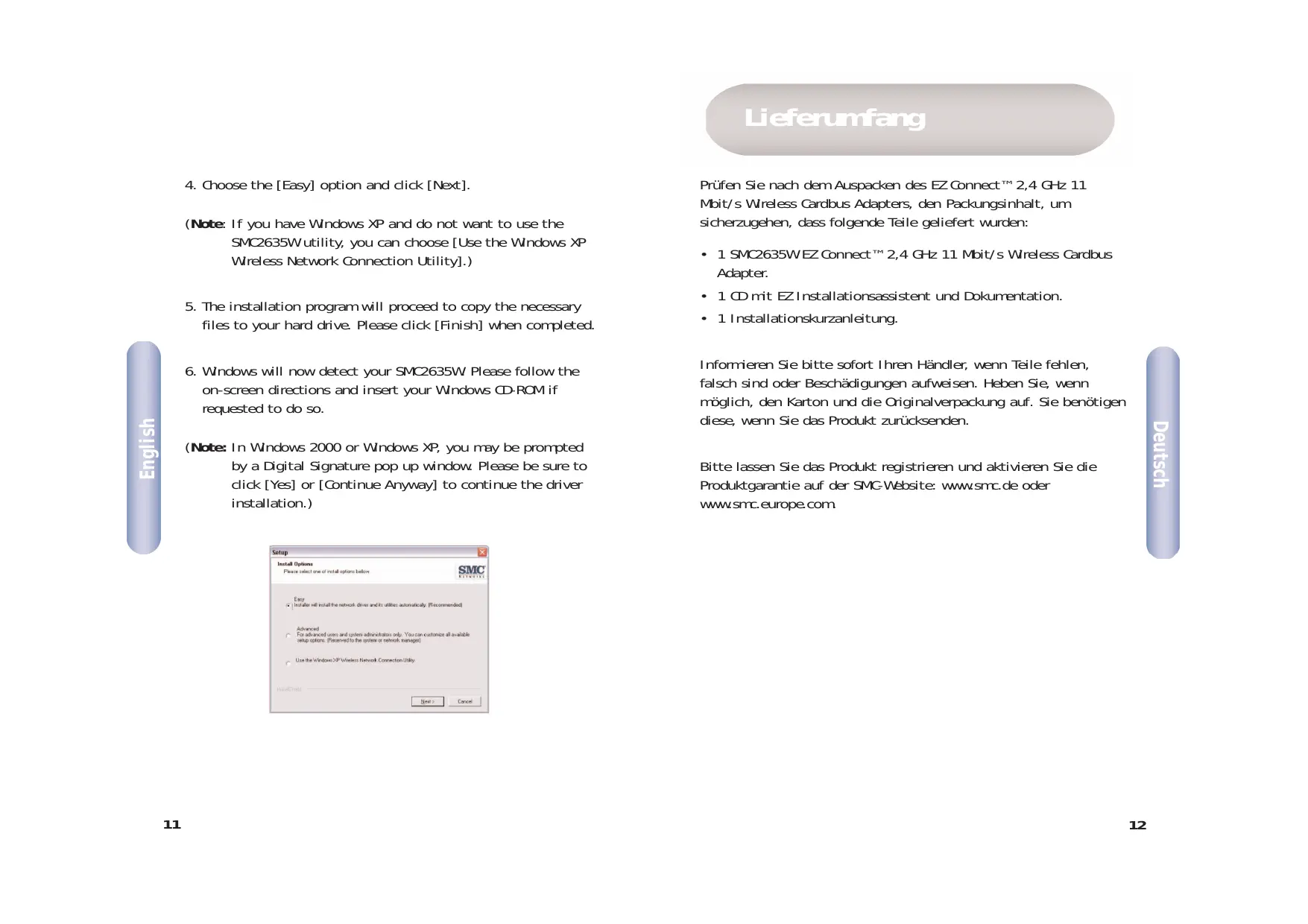 on-screen directions and insert your Windows CD-ROM if requested to do so. Prüfen Sie nach dem Auspacken des EZ Connect™ 2,4 GHz 11 Mbit/s Wireless Cardbus Adapters, den Packungsinhalt, um sicherzugehen, dass folgende Teile geliefert wurden: Bitte lassen Sie das Produkt registrieren und aktivieren Sie die Produktgarantie auf der SMC-Website: www.smc.de oder www.smc.europe.com.