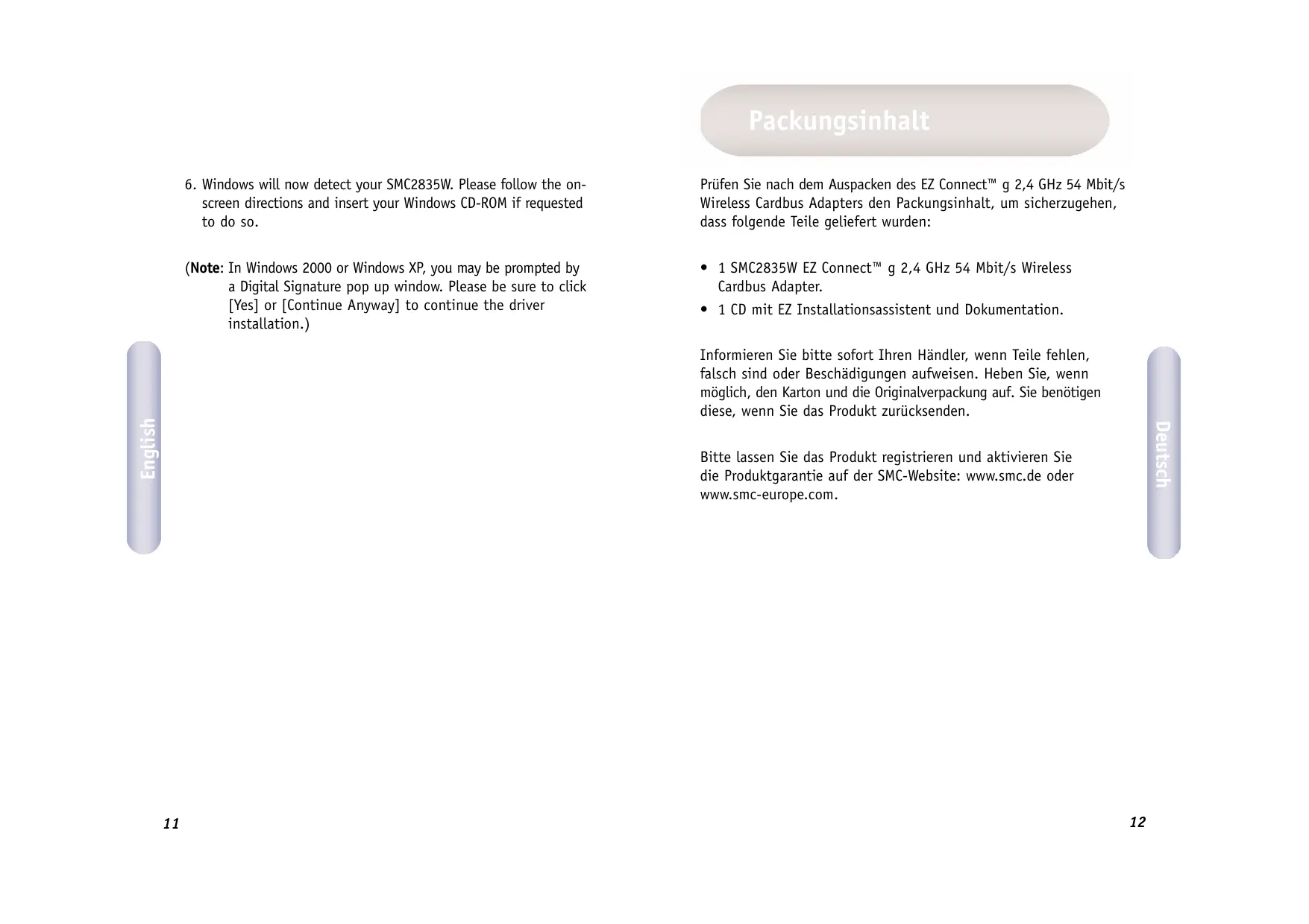 screen directions and insert your Windows CD-ROM if requested to do so. (Note: In Windows 2000 or Windows XP, you may be prompted by a Digital Signature pop up window. Please be sure to click [Yes] or [Continue Anyway] to continue the driver installation.) Prüfen Sie nach dem Auspacken des EZ Connect" g 2,4 GHz 54 Mbit/s Wireless Cardbus Adapters den Packungsinhalt, um sicherzugehen, dass folgende Teile geliefert wurden: + 1 SMC2835W EZ Connect" g 2,4 GHz 54 Mbit/s Wireless Cardbus Adapter. + 1 CD mit EZ Installationsassistent und Dokumentation. Informieren Sie bitte sofort Ihren Händler, wenn Teile fehlen, falsch sind oder Beschädigungen aufweisen. Heben Sie, wenn môüglich, den Karton und die Originalverpackung auf. Sie benôtigen diese, wenn Sie das Produkt zurücksenden. Bitte lassen Sie das Produkt registrieren und aktivieren Sie die Produktgarantie auf der SMC-Website: www.smc.de oder Www.smc-europe.com.